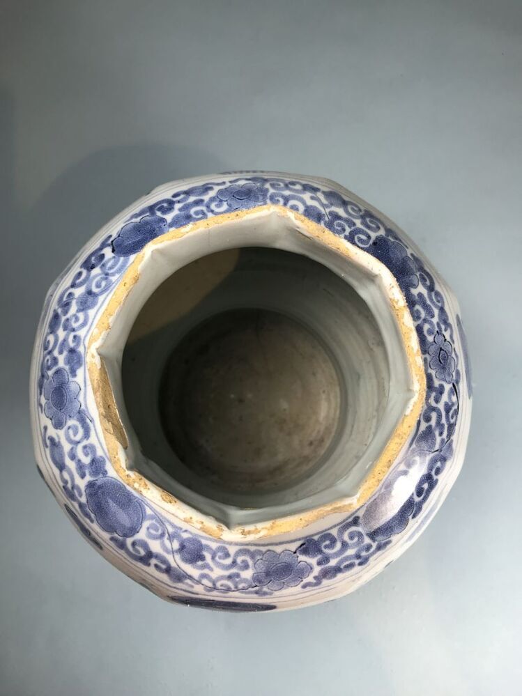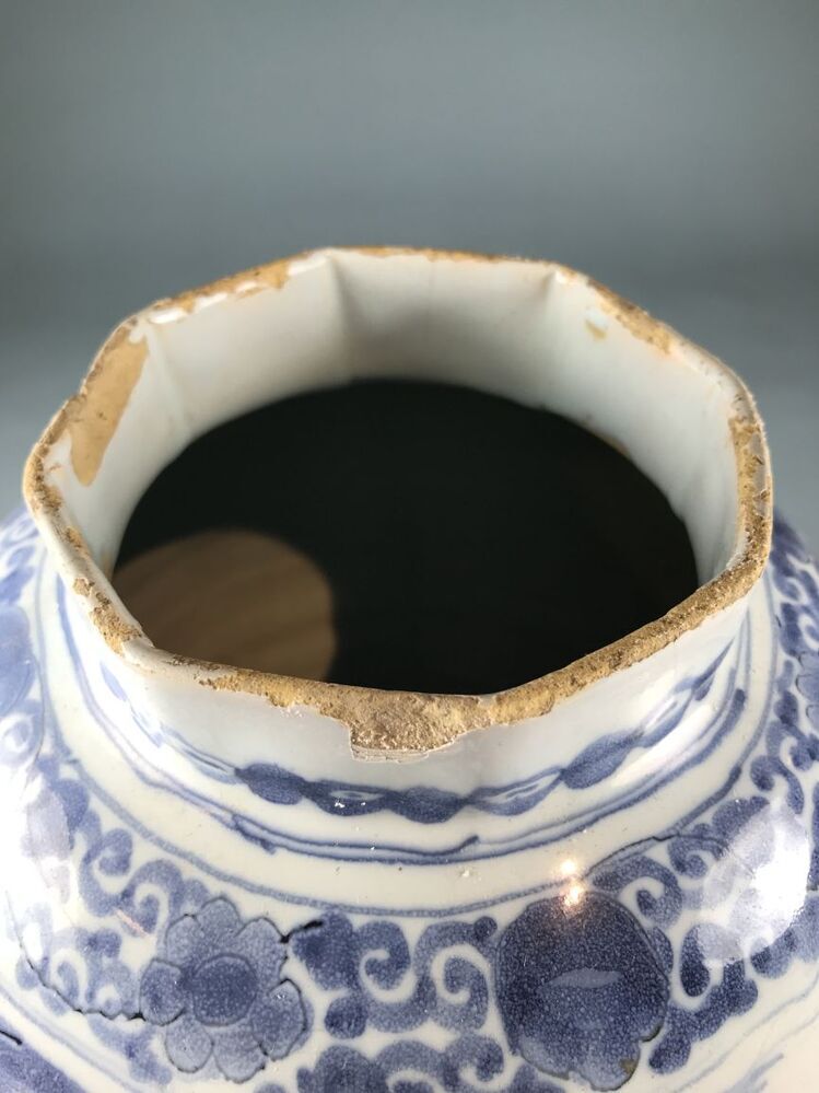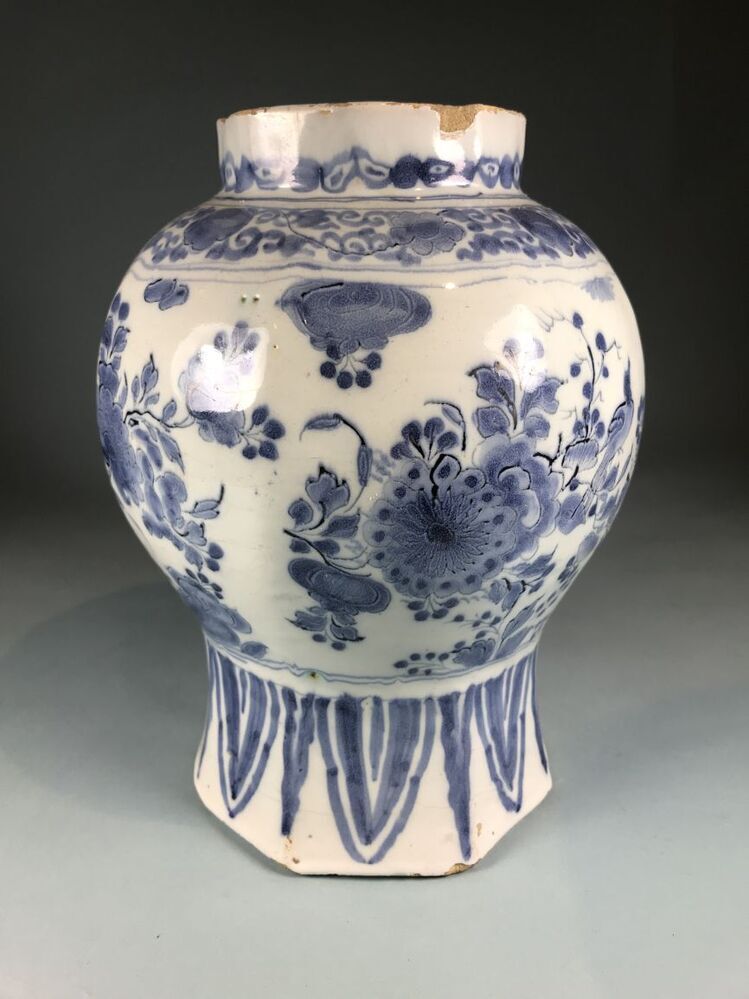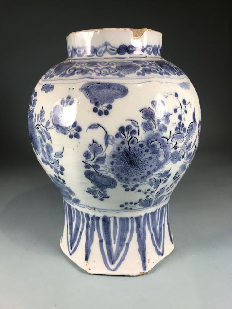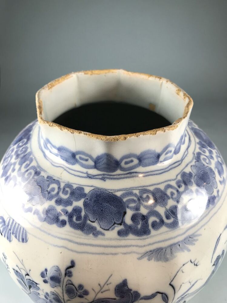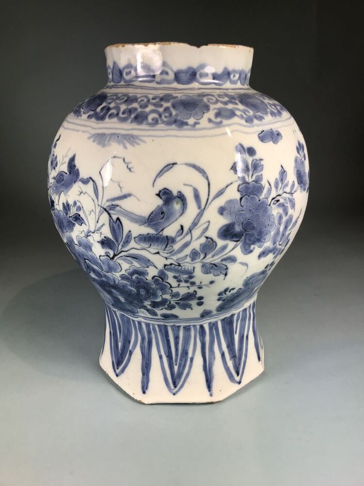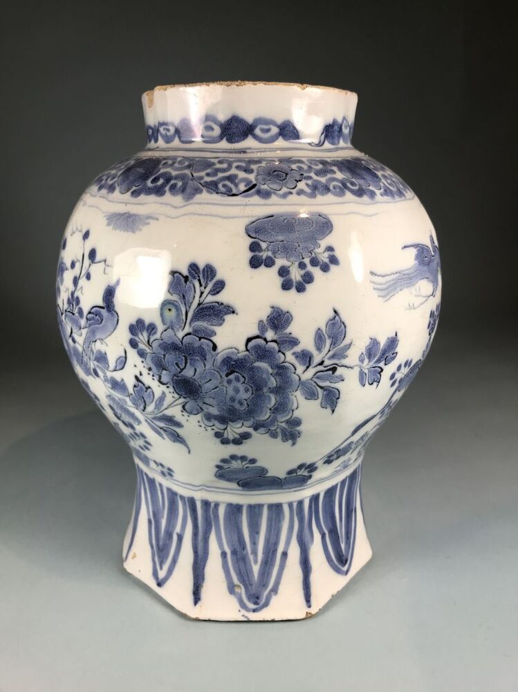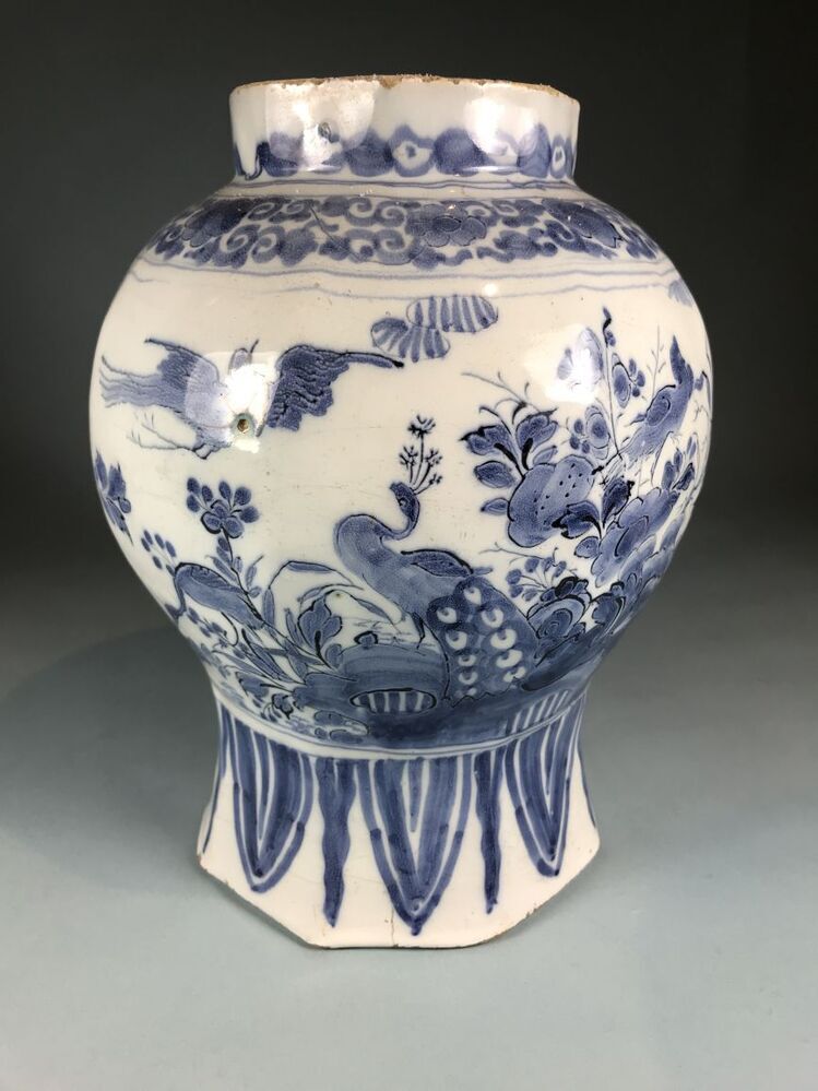 Pot met een licht balustervormige wand, in blauw gedecoreerd op een blauwig wit glazuur met een voorstelling van pauwen en bloemen.||Delft||onbekend||Keramiekmuseum Princessehof NO 05775 |