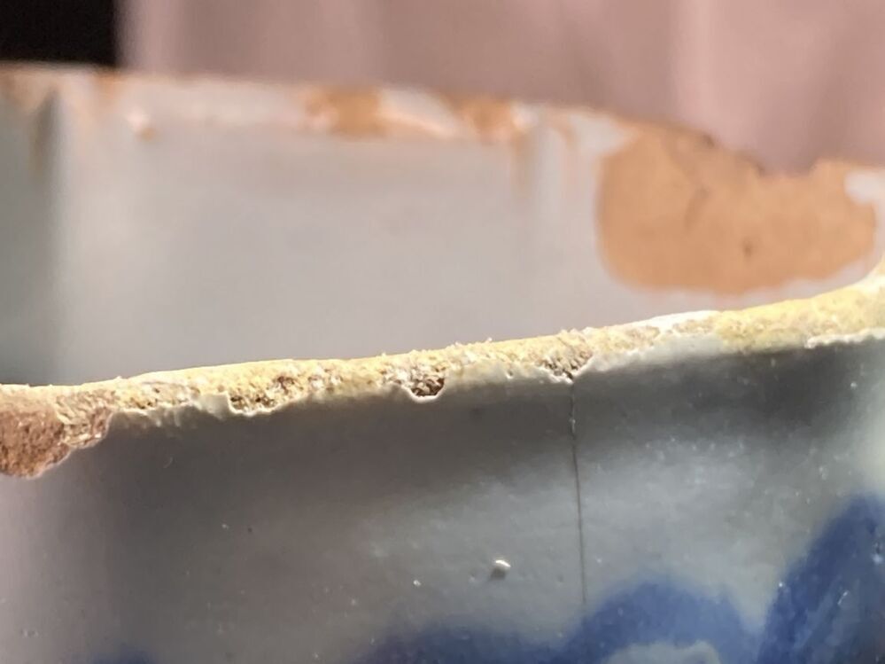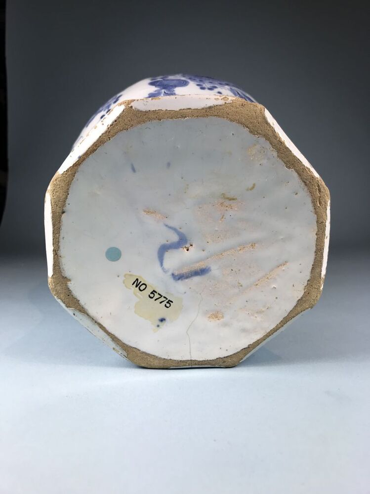 Pot met een licht balustervormige wand, in blauw gedecoreerd op een blauwig wit glazuur met een voorstelling van pauwen en bloemen.||Delft||onbekend||Keramiekmuseum Princessehof NO 05775