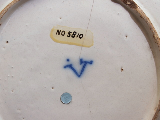 Bord, in blauw gedecoreerd op een rozig wit glazuur een een bruine lip. Het plat is versierd met een chinoiserievoorstel...722-1724)||De Dubbelde Schenkkan, plateelbakkerij (periode Jacob van Thiel 1715-1735)||Keramiekmuseum Princessehof NO 05810 |