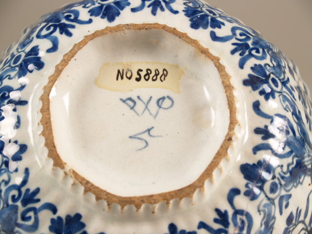 Kom met een geribbelde wand, in blauw-wit gedecoreerd met een achtvoudig symetrisch plantaardig motief op de wand en op de bodem een boeket. (Nederlands)