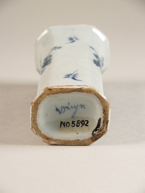 Bekervaas, in blauw gedecoreerd op een blauwig wit glazuur. Centraal in een cartouche in een rococostijl de voorstelling...as gedecoreerd met takjes.||Delft||De Porceleyne Schotel, plateelbakkerij (1598-1791)||Keramiekmuseum Princessehof NO 05892 |