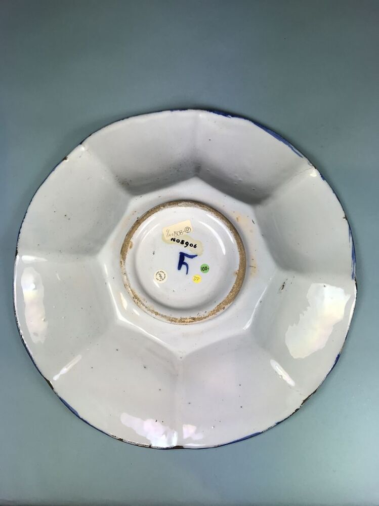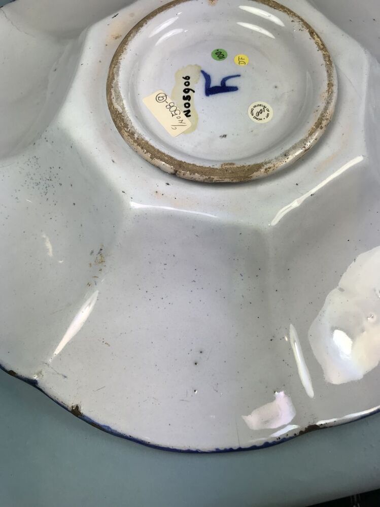 Plooischotel met wand in acht lobben, gedecoreerd in blauw op een blauwig wit glazuur. Centraal en op vier van de acht l...inoiseriedecor en op de vier andere lobben een decor van chrysanten.||Delft||onbekend||Keramiekmuseum Princessehof NO 05906