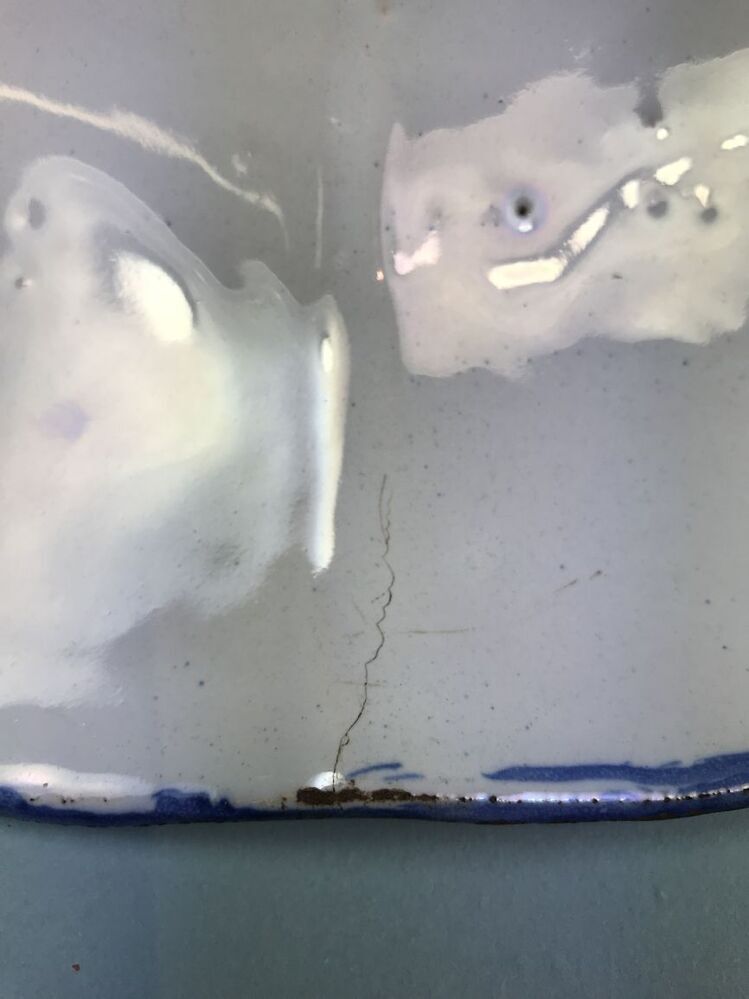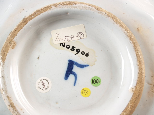 Plooischotel met wand in acht lobben, gedecoreerd in blauw op een blauwig wit glazuur. Centraal en op vier van de acht l...inoiseriedecor en op de vier andere lobben een decor van chrysanten.||Delft||onbekend||Keramiekmuseum Princessehof NO 05906 |