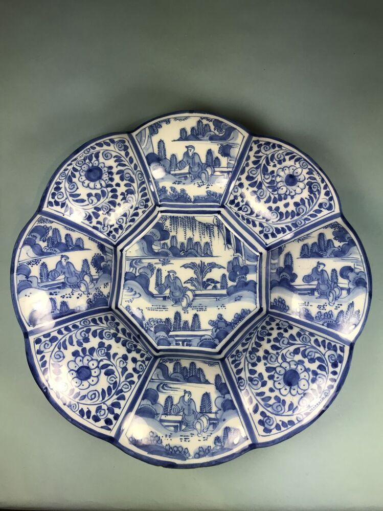Plooischotel met wand in acht lobben, gedecoreerd in blauw op een blauwig wit glazuur. Centraal en op vier van de acht lobben een chinoiseriedecor en op de vier andere lobben een decor van chrysanten. (Nederlands)