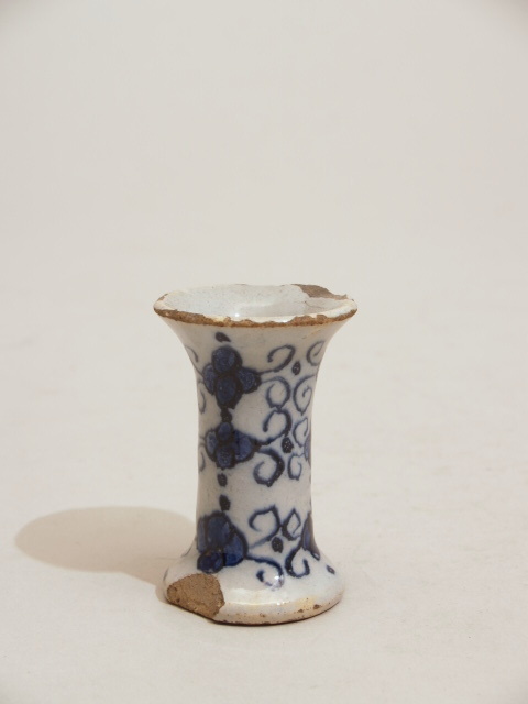 Miniatuurvaas met een trompetvormige wand, in blauw gedecoreerd op een blauwig wit glazuur met een regelmatig patroon van bloemen en ranken. (Nederlands)