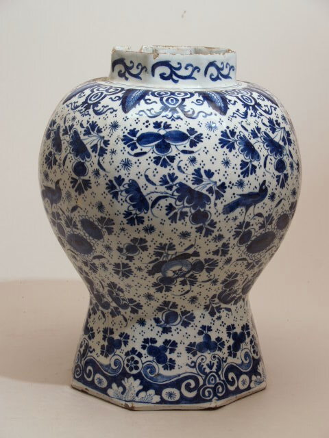 Balustervormige pot, in blauw gedecoreerd op een wit glazuur met een strooidecor van bloemen, stippen en vogels. (Nederlands)