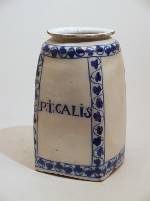 Apothekerspot in blauw-wit met vier hoeken, op de hoeken en lang de onder- en bovenzijde gedecoreerd met een doorlopend bloemmotief tussen twee lijnen en midden voor de tekst: 'P;IC;ALIS' (Nederlands)