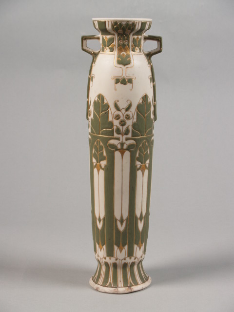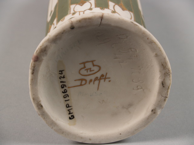 Vaas van porselein-biscuit (mat, ongeglazuurd), gedecoreerd met abstracte, gestileerde florale motieven bestaande uit met goud ingevulde inkervingen en decoraties in groene slib (pâte-sur-pâte). In 1876 werd De Porceleyne Fles overgenomen door Joost Thooft. Onder leiding van Thooft en Adolf le Comte ontwikkelde de fabriek diverse soorten Vernieuwingsaardewerk. Rond 1900 werd het porselein-biscuit ontwikkeld. Dit arbeidsintensieve product, waarbij er gebruik werd gemaakt van dunne laagjes gekleurd (meestal groen) porselein. De inkervingen werden gemaakt in het nog ongebakken voorwerp en opgevuld met goud. Vervolgens werden de stukken in de moffeloven geplaatst waardoor het goud zich onder lage temperaturen kon vasthechten. Het porselein-biscuit was tot circa 1905 in productie. (Nederlands)
