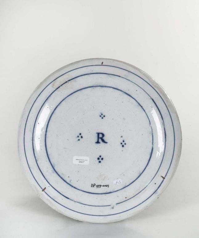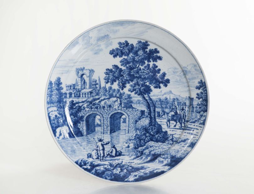 Bord zonder standring, Op het plat en de rand van het bord is een voorstelling in blauw geschilderd van een italianiserend landschap, gestoffeerd met o.a. ruïnes, een stenen brug en diverse figuren. (Nederlands)
