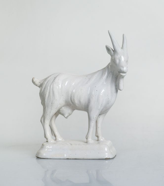 Beeld in de vorm van een bok, staande op een getrapte rechthoekige basis, bedekt met wit tinglazuur (Nederlands)