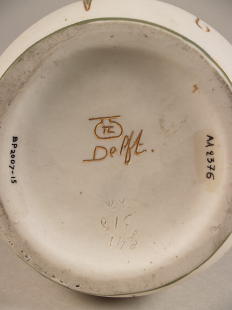 Vaas van porselein-biscuit (mat, ongeglazuurd), gedecoreerd met een liniair decor van abstracte, gestileerde motieven bestaande uit met goud ingevulde inkervingen en decoraties in groene slib (pâte-sur-pâte). In 1876 werd De Porceleyne Fles overgenomen door Joost Thooft. Onder leiding van Thooft en Adolf le Comte ontwikkelde de fabriek diverse soorten Vernieuwingsaardewerk. Rond 1900 werd het porselein-biscuit ontwikkeld. Dit arbeidsintensieve product, waarbij er gebruik werd gemaakt van dunne laagjes gekleurd (meestal groen) porselein. De inkervingen werden gemaakt in het nog ongebakken voorwerp en opgevuld met goud. Vervolgens werden de stukken in de moffeloven geplaatst waardoor het goud zich onder lage temperaturen kon vasthechten. Het porselein-biscuit was tot circa 1905 in productie. (Nederlands)