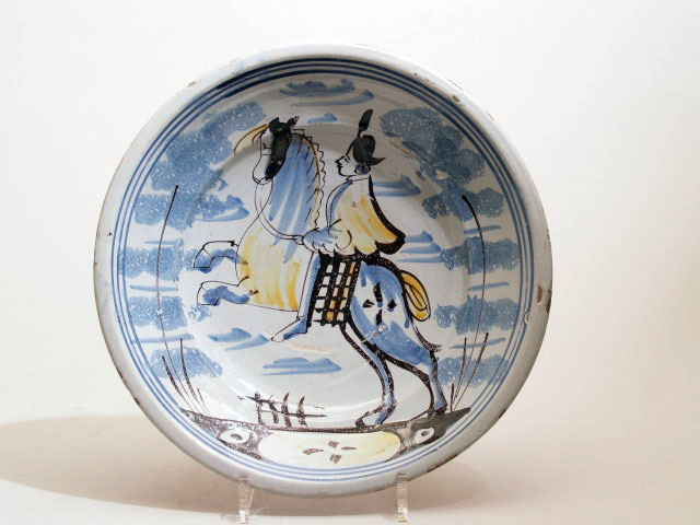 Schotel, gedecoreerd met een doorlopende, polychrome voorstelling van een ruiter op een steigerend paard.||Nederland||onbekend||Keramiekmuseum Princessehof OKS 2005-184