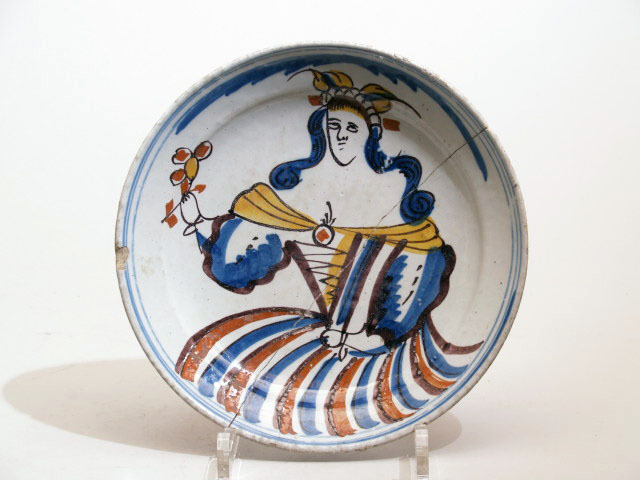 Schotel met een wit fond met daarop een polychrome beschildering van een vrouwfiguur met een bloem in de linker hand. (Nederlands)