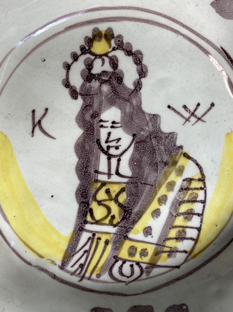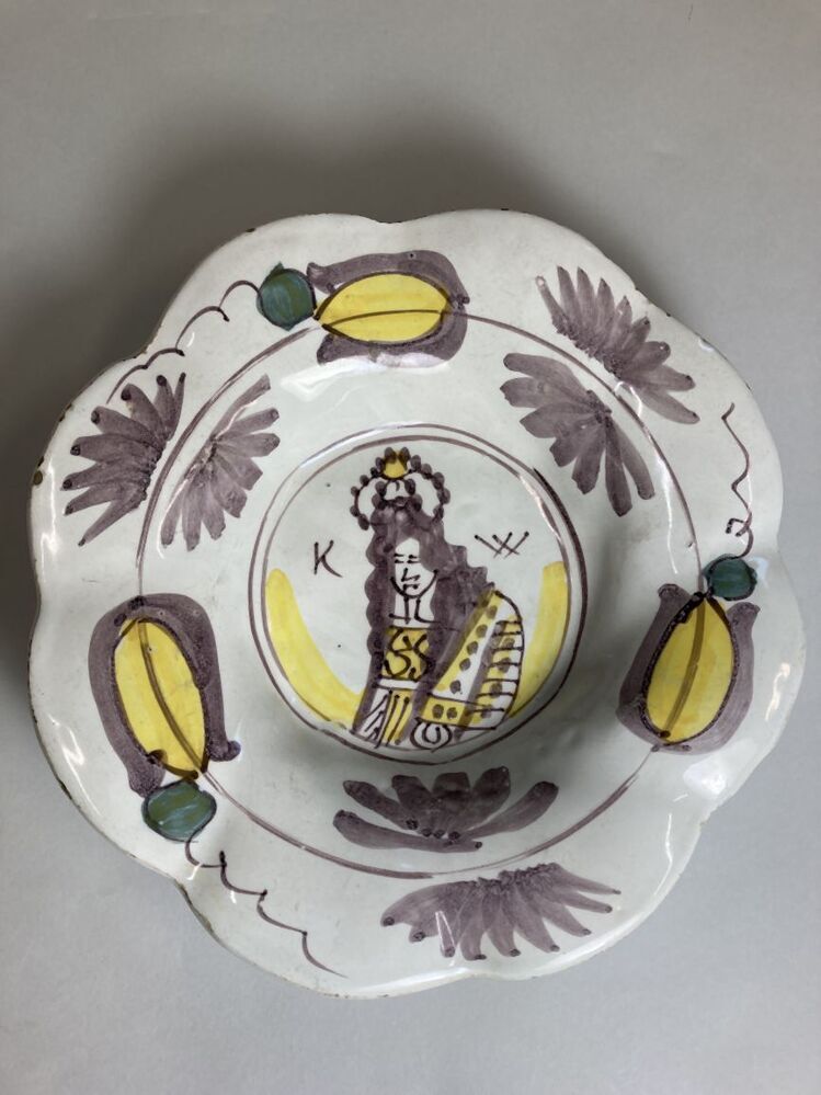 Een plooischotel, gedecoreerd in de kleuren mangaan, groen en geel. Het plat is gedecoreerd met een portret van Koning-Stadhouder Willem III met koningskroon en de letters KW. (Nederlands)