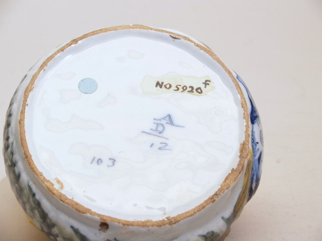 Ronde bak (pot/ terrine waarvan het deksel mist?), in reliëf en polychroom versierd met een decor van vissen. (Nederlands)