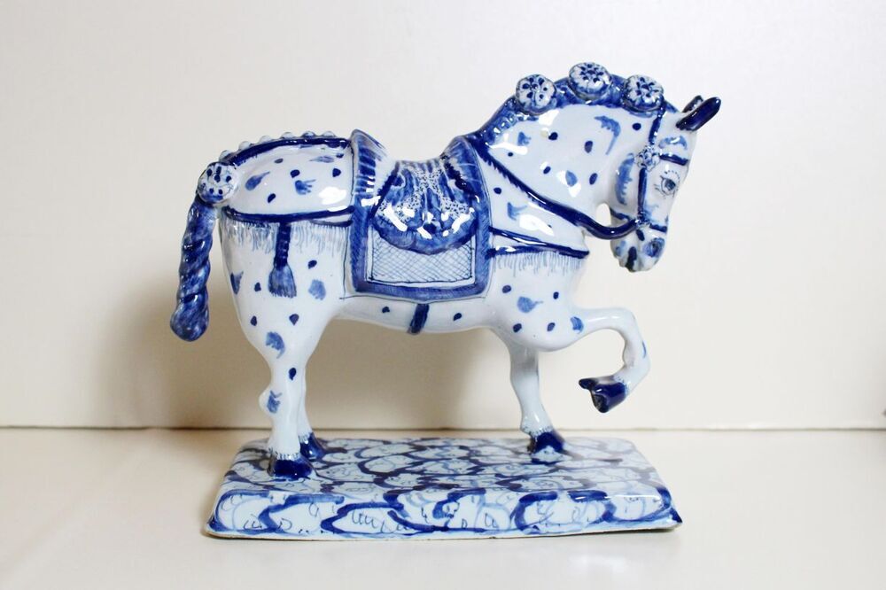 Beeld in de vorm van een staand, opgetuigd paard, in blauw-wit gedecoreerd. Het rechterbeen is opgetild, het hoofd naar ... decor. Het beeld is onderdeel van een stel van twee stuks, die naar elkaar gericht zijn.||Delft||Princessehof OKS 1998037A |