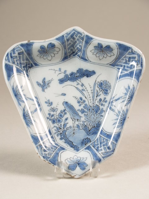 Schaaltje van een confiturenset in blauw-wit gedecoreerd met een op kraakporselein geïnspireerd chinoiseriedecor.||Delft||De Grieksche A, plateelbakkerij (periode Adrianus Kocx 1686-1701)||Keramiekmuseum Princessehof NO 05786.A