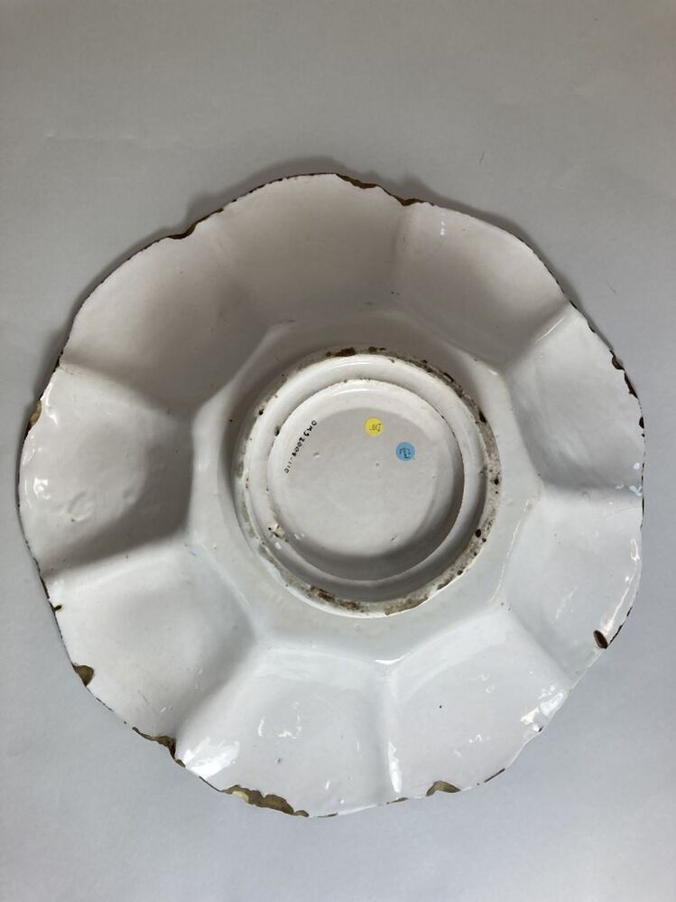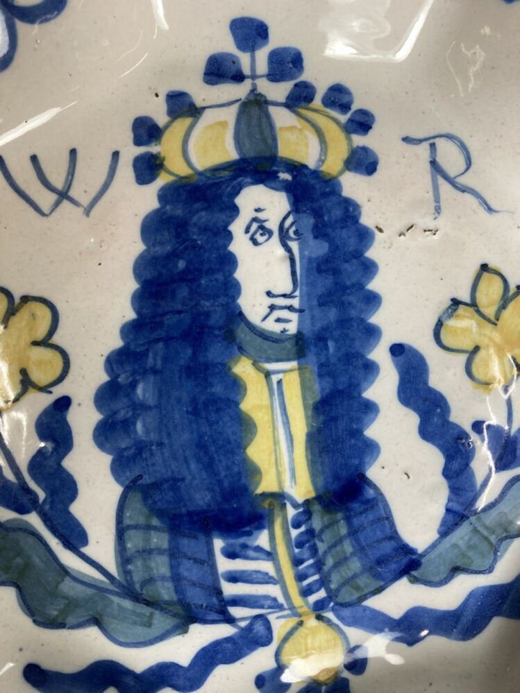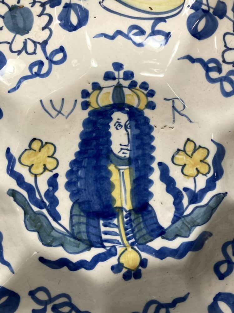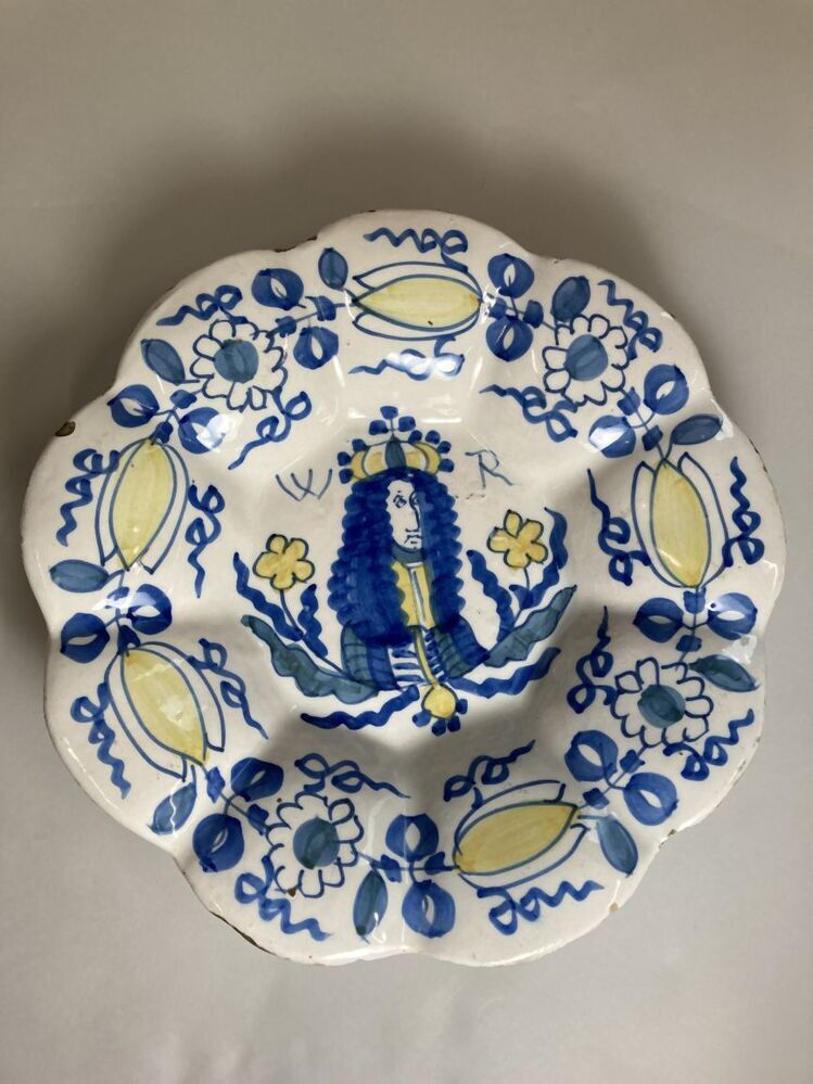 Plooischotel met een wit fond, in blauw en geel gedecoreerd met op het plat de beeltenis van Koning-Stadhouder Willem II...and van de schotel is rijkelijk versierd met een floraal motief.||Delft||onbekend||Keramiekmuseum Princessehof OKS 2005-110