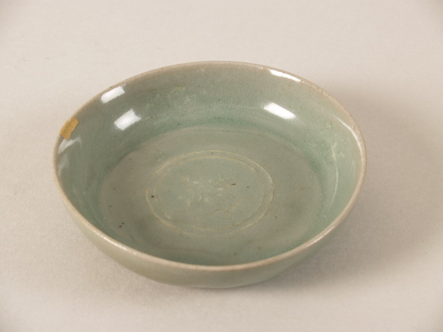 Schaal met celadon glazuur en een decor van ingelegd slib van een bloem binnen twee cirkels. Op de onderkant zitten drie proenafdrukken. Celadon Op de rand zit een kintsugi reparatie. Deze glasachtige glazuur staat bekend als bisaek en werd ontwikkeld in de Gangjin ovens in het zuidwesten van Korea. Zowel in deze als de Buan ovens werd dit toegepast en de productie hiervan beleefde zijn hoogtepunt tijdens de 12-13e eeuw. Het glazuur is doorschijnend (maar niet volledige transparant), waardoor de decoratie eronder subtiel zichtbaar wordt. (Nederlands)