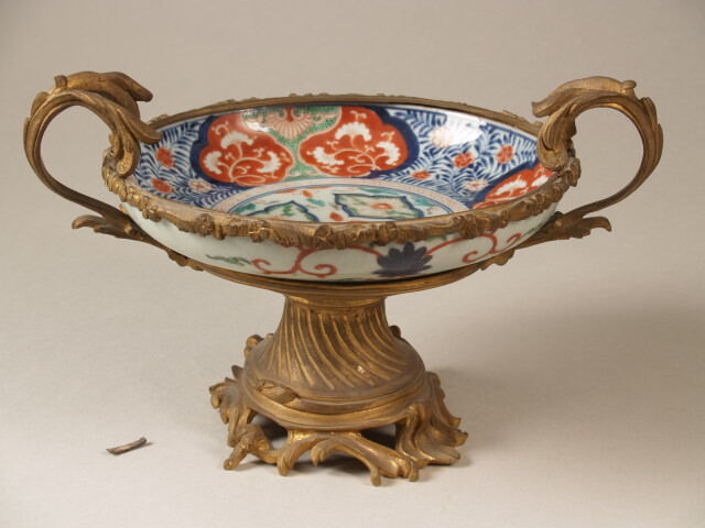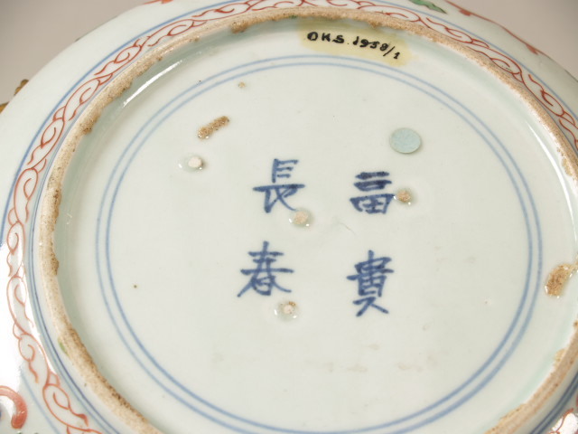 Platte bodem, v-vorm. voetring, bolspreidende wand. materiaal: Porseleinachtig lichtgrijs steengoed met blauw getint glazuur. Onder op de bodem vier groensporen, op de ongeglazuurde voetring ovenzand. Versiering: In Kobalt blauw onder en ijzerrood, twee tinten groen en resten van goud op het glazuur; spiegel drie ruitvormige cartouches met accoladevormige zijden inhoudende elk een bloem en ranken op een fond van zwartgestippeld groen. (Nederlands)