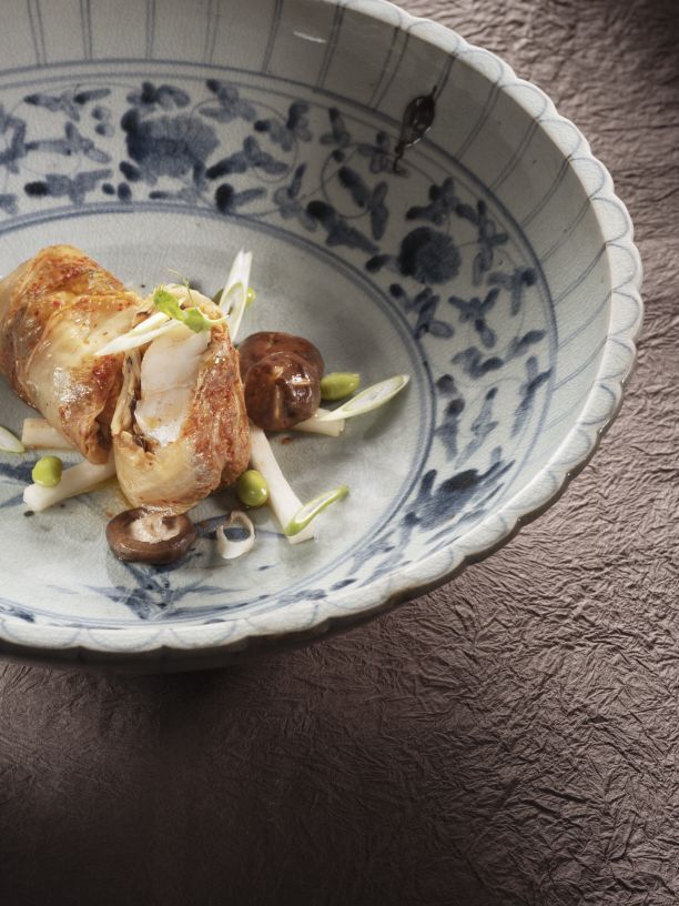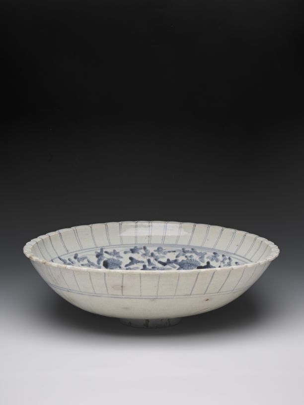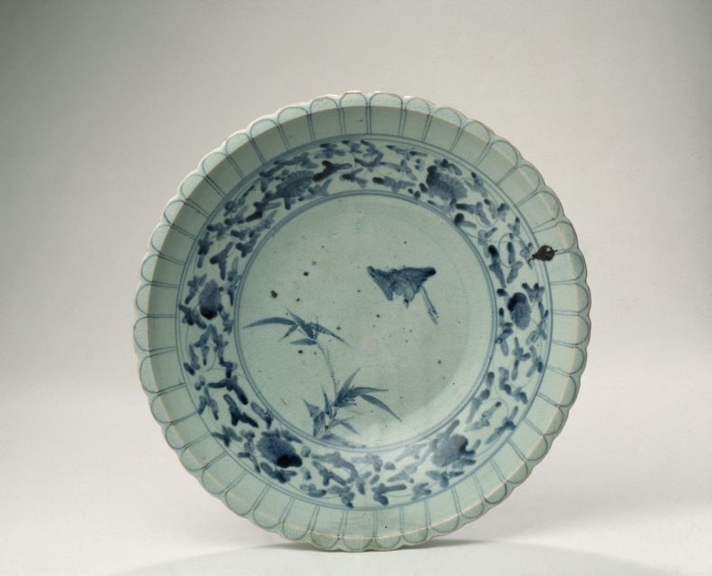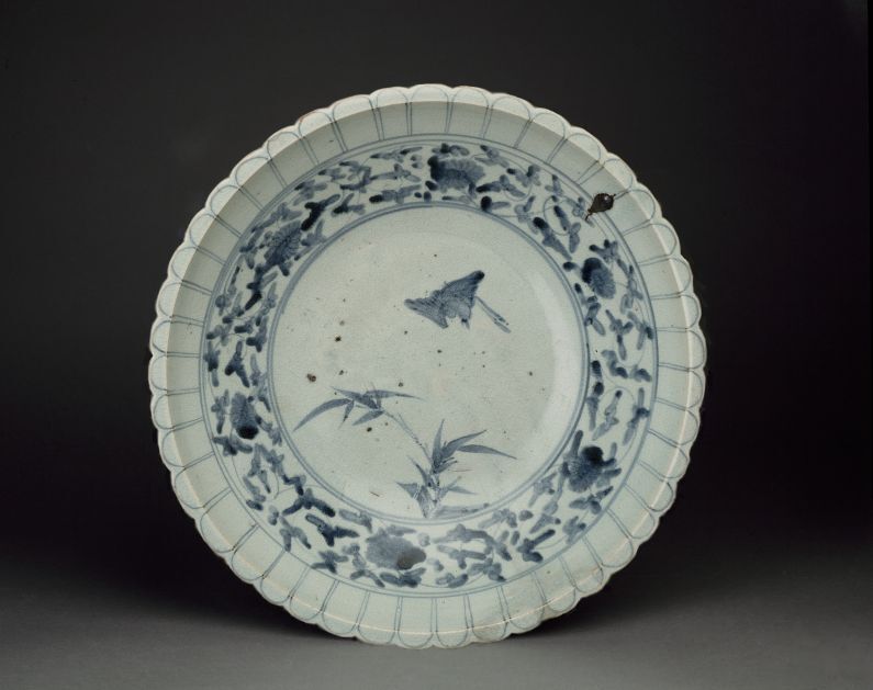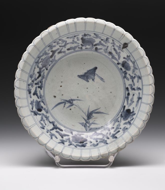 Schaal op een dikke voetring, met een geschulpte rand, versierd in onderglazuur blauw. Aan de bovenzijde een centrale voorstelling van een vliegende kraanvogel en bamboe. Op de wand een rand met bloem- en bladranken. Daarboven radiale boogvormige lijnen die corresponderen met de geschulpte lip. Deze bogen zijn ook op de buitenzijde aangebracht. Op de bovenzijde van de wand is een dikke druppel ijzer te zien. Op het middenvlak zijn wederom resten van ijzer aanwezig. Als gevolg van de bezetting van Korea door Toyotomi Hideyoshi (vanaf 1590 Korea binnengevallen) vestigen eind zestiende eeuw Koreaanse pottenbakkers zich gedwongen in Japan op het eiland Kyushu. Porselein was al bekend in Japan, het werd in grote hoeveelheden uit China en in mindere mate uit Korea geïmporteerd. In de omgeving van Arita, in de provincie Hizen, vindt men begin zeventiende eeuw de juiste ingrediënten om porselein mee te maken. Een van deze pottenbakkers uit Korea was Ri Sampei, hij wordt gezien als de ‘vader’ van het Japanse porselein en volgens de overlevering is het hem in 1616 voor het eerste gelukt om porselein te maken. Daarvoor waren er al wel experimenten, maar nog niet succesvol. Vanaf de vroege... (Nederlands)