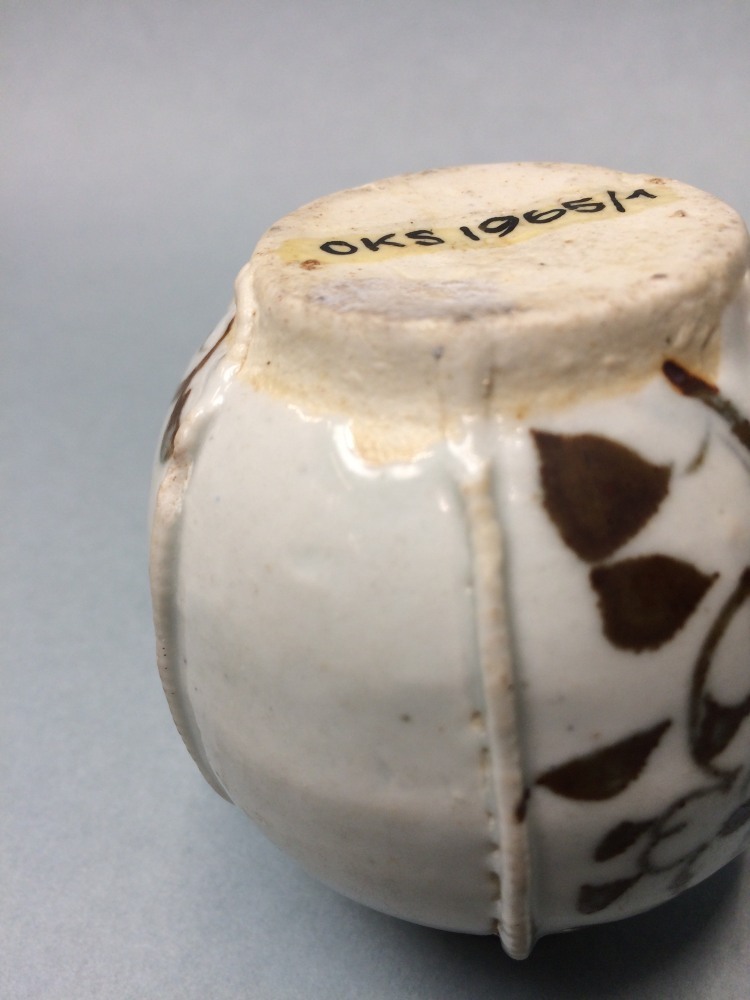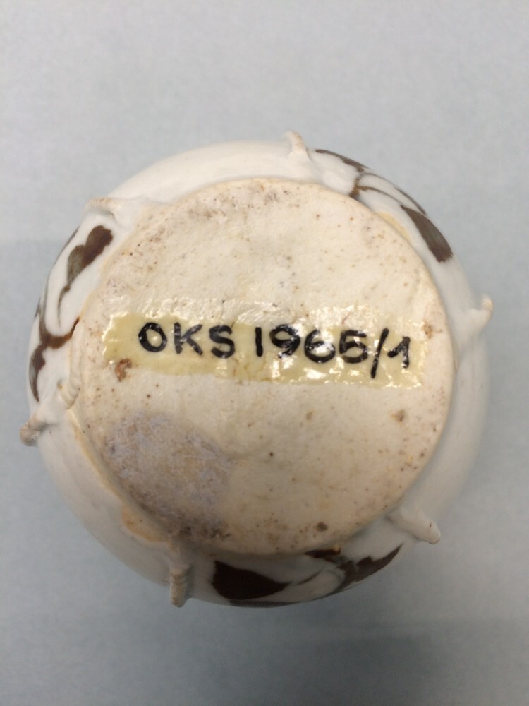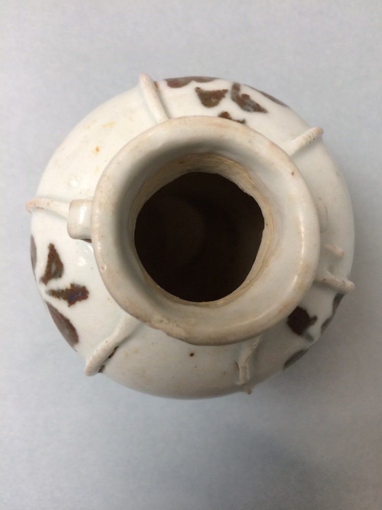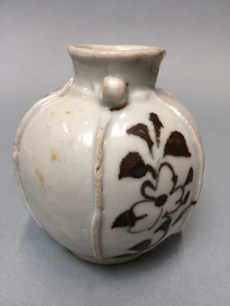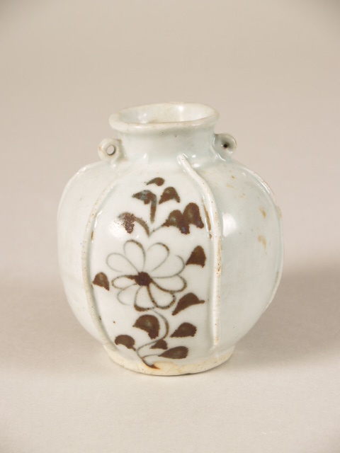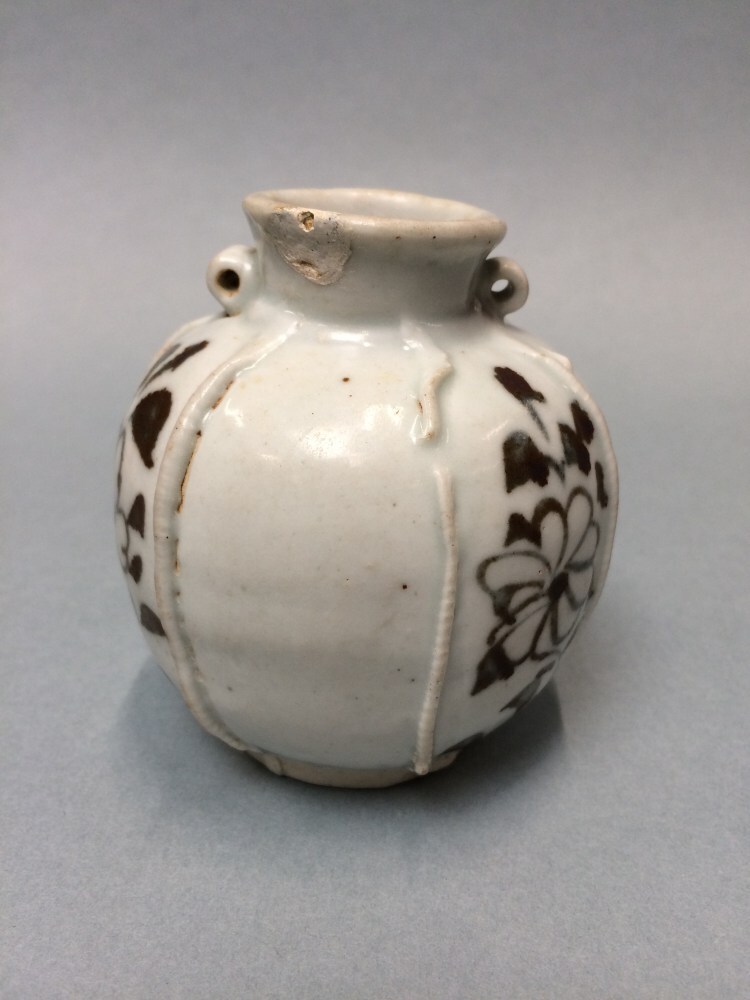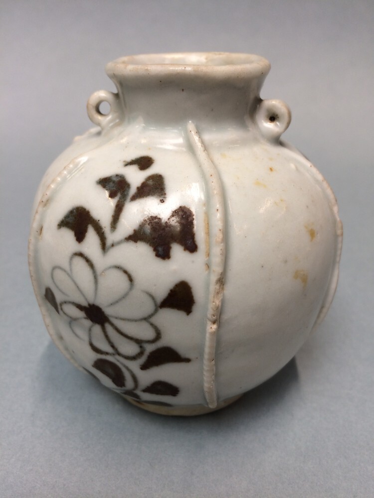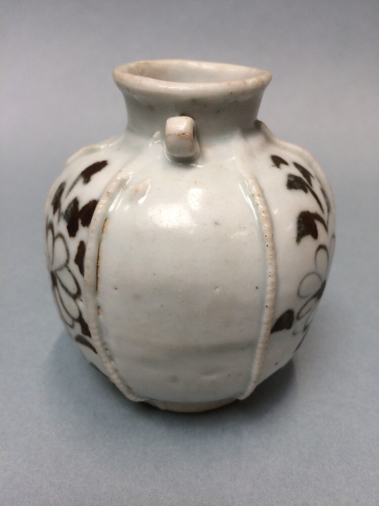Potje met twee lusoren en verticale ribbels gedecoreerd onder het glazuur met bloemranken in ijzerbruin. De toepassing van ijzerbruin pigment werd in de Yuan periode toegepast op Longquan celadon en Jingdezhen porselein. Bij opgravingen in Jingdezhen, o.a. Luomaqiao, zijn scherven porselein met deze decoratie aangetroffen. Op het Sinan scheepwrak (1323) zijn van beide voorbeelden verschillende exemplaren aangetroffen die bestemd waren voor de Japanse markt. Dit soort kleine vaasjes zijn regelmatig aangetroffen op verschillende plaatsen in Zuidoost Azië. (Nederlands)