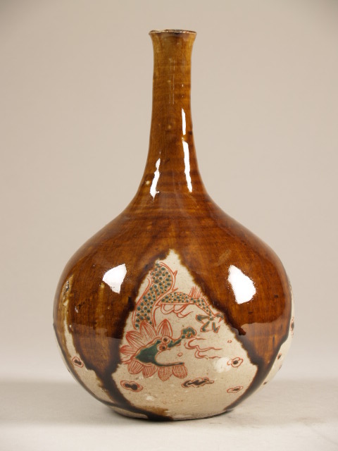Fles met decor van draak en bedekt met bruin glazuur (Nederlands)