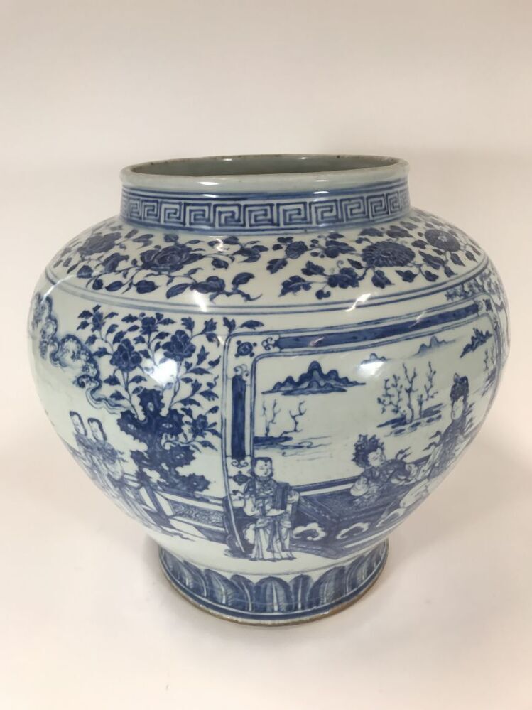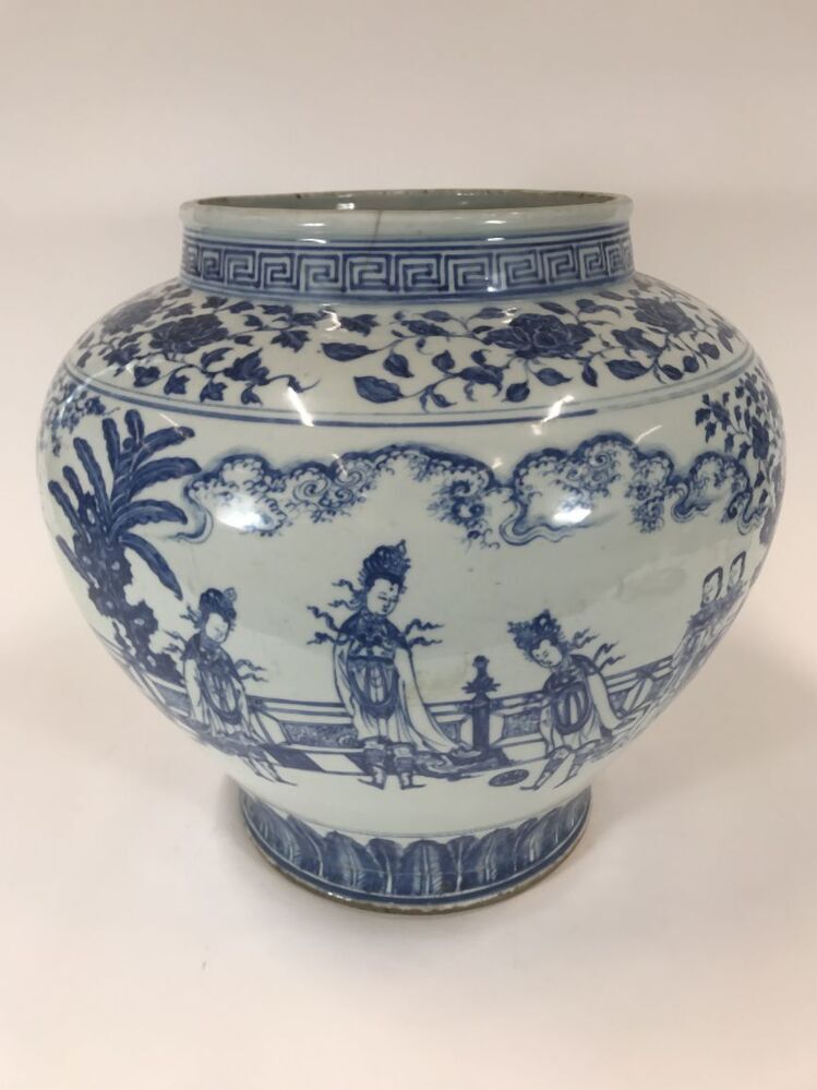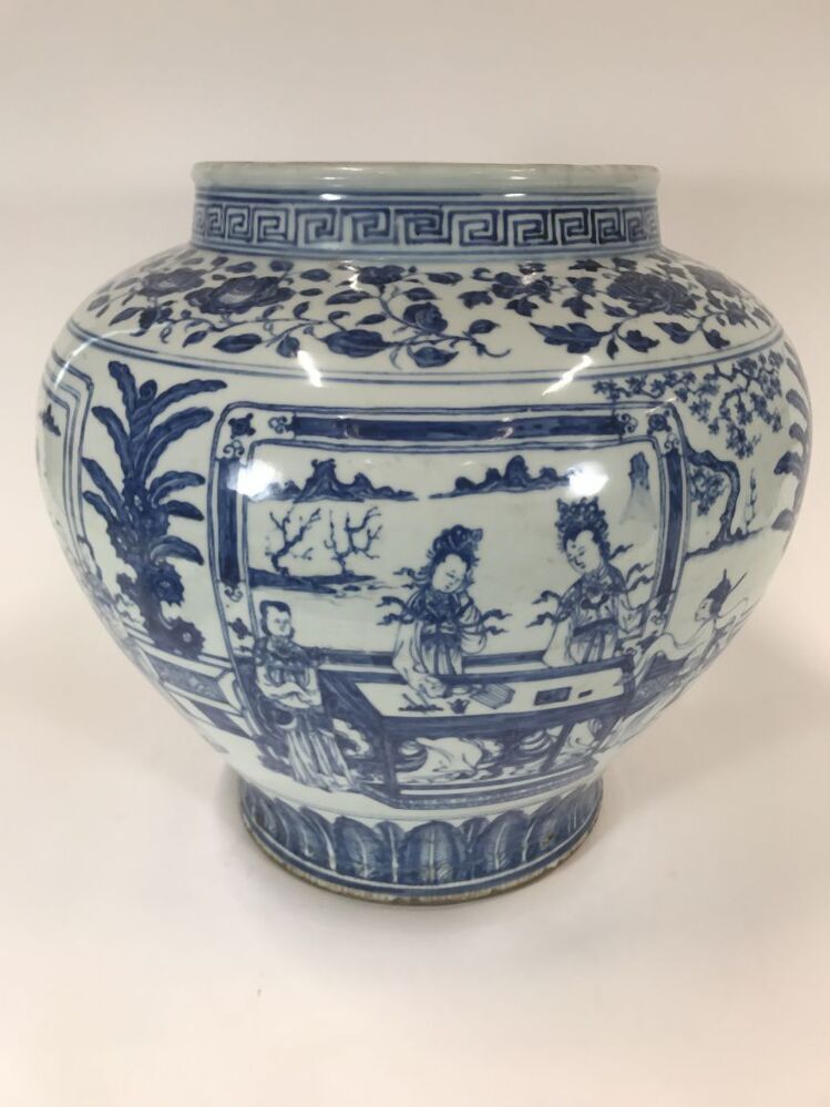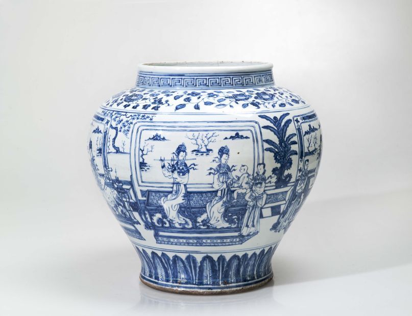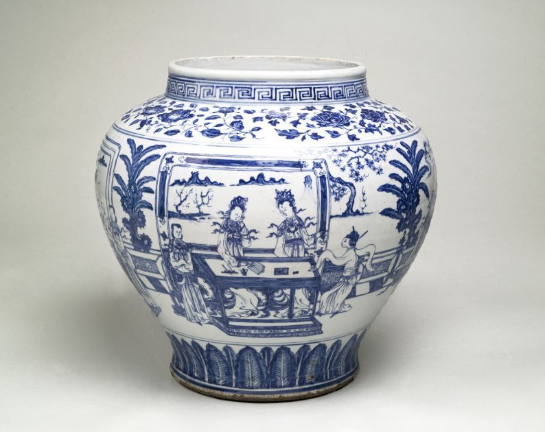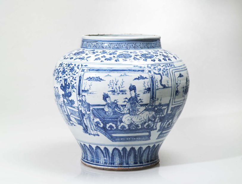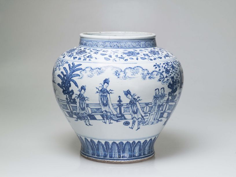 Deze zware, maar toch sierlijke pot heeft een eivormig lichaam en een korte hals met een verdikking aan de rand. Waarschijnlijk werd de pot gebruikt om wijn in te bewaren. De pot is opgebouwd uit twee individuele stukken die horizontaal aan elkaar zijn bevestigd. De onderkant is ongeglazuurd. De decoratie op de buik toont hofdames die in een tuin verschillende vrijetijdsactiviteiten uitvoeren. De tuin is weergegeven door rotspartijen, bananenbomen en elegante tuinhekken. Er zijn in totaal vier verschillende scènes te zien: drie spelen zich af voor grote, met landschap beschilderde kamerschermen, en één is vrij in de tuin geplaatst. De vier scènes refereren aan de siyi, de Vier Kunsten, de vrijetijdsactiviteiten die de rijke Chinese elite beoefenden. In China worden deze activiteiten ook wel 'qin qi shu hua' genoemd. Hieronder behoort het bespelen van de qin of guqin, een snaarinstrument dat overeenkomsten vertoont met een citer; het spelen van het spel qi of weiqi, letterlijk ‘omsingelspel’, dit bordspel wordt gespeeld met zwarte en witte stenen en is vergelijkbaar met schaken; het beoefenen van shu, de kunst van de kalligrafie; en hua, schilderen. In de door mannen gedomineer... (Nederlands)