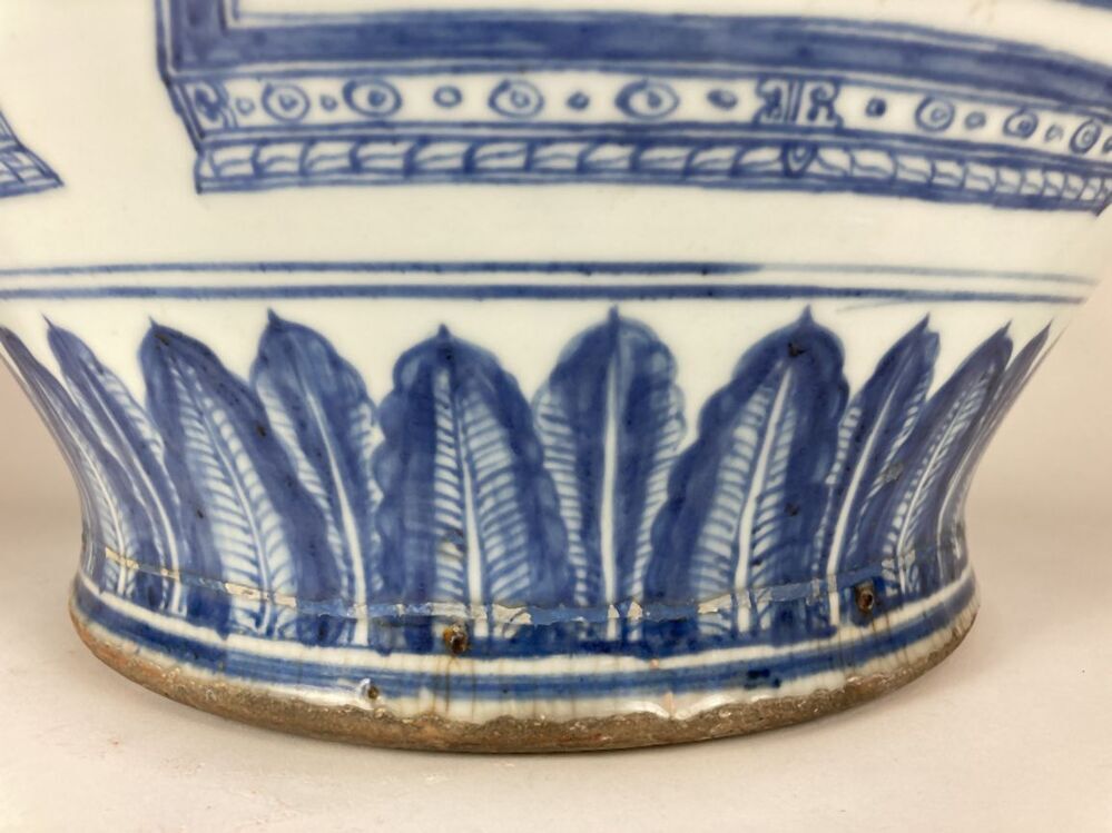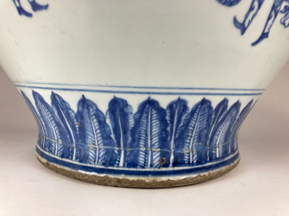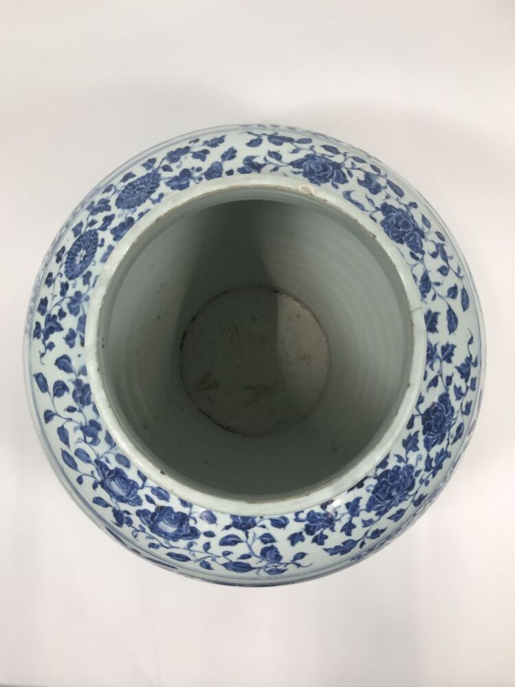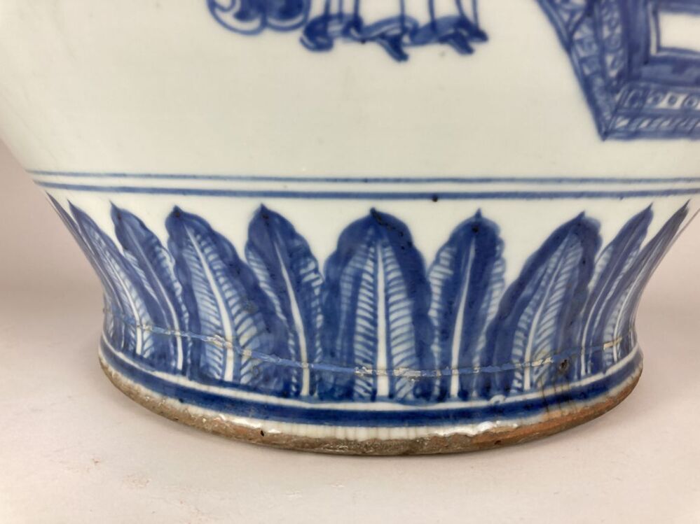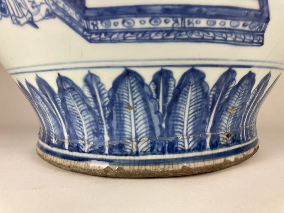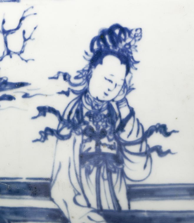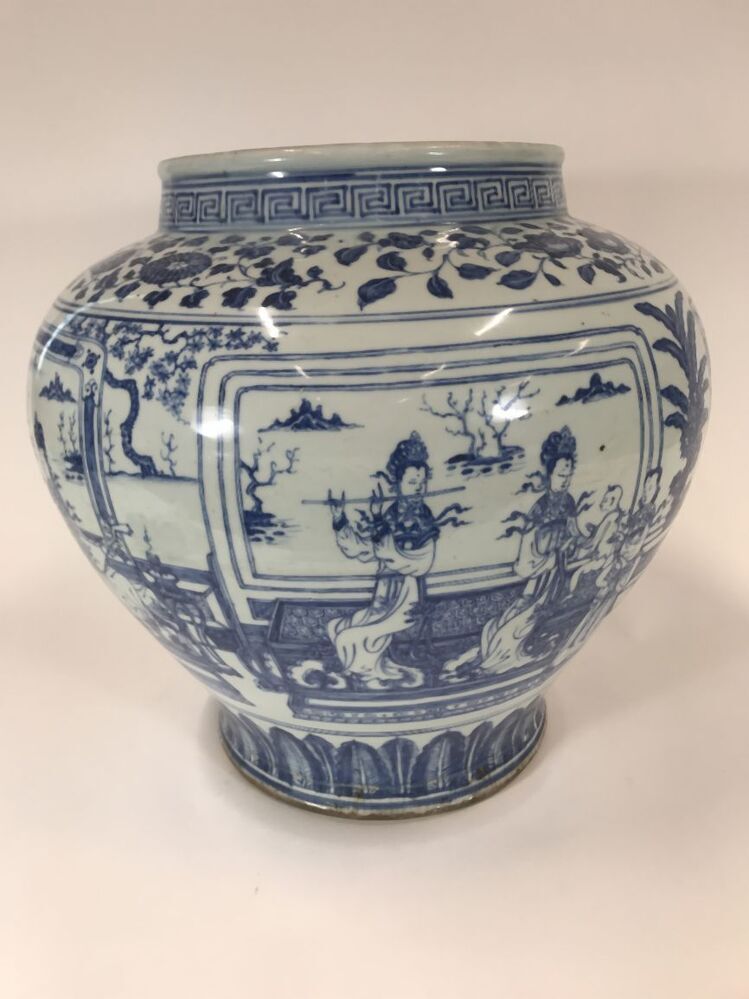 Deze zware, maar toch sierlijke pot heeft een eivormig lichaam en een korte hals met een verdikking aan de rand. Waarschijnlijk werd de pot gebruikt om wijn in te bewaren. De pot is opgebouwd uit twee individuele stukken die horizontaal aan elkaar zijn bevestigd. De onderkant is ongeglazuurd. De decoratie op de buik toont hofdames die in een tuin verschillende vrijetijdsactiviteiten uitvoeren. De tuin is weergegeven door rotspartijen, bananenbomen en elegante tuinhekken. Er zijn in totaal vier verschillende scènes te zien: drie spelen zich af voor grote, met landschap beschilderde kamerschermen, en één is vrij in de tuin geplaatst. De vier scènes refereren aan de siyi, de Vier Kunsten, de vrijetijdsactiviteiten die de rijke Chinese elite beoefenden. In China worden deze activiteiten ook wel 'qin qi shu hua' genoemd. Hieronder behoort het bespelen van de qin of guqin, een snaarinstrument dat overeenkomsten vertoont met een citer; het spelen van het spel qi of weiqi, letterlijk ‘omsingelspel’, dit bordspel wordt gespeeld met zwarte en witte stenen en is vergelijkbaar met schaken; het beoefenen van shu, de kunst van de kalligrafie; en hua, schilderen. In de door mannen gedomineer... (Nederlands)