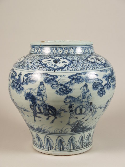 Grote pot met op de buik een voorstelling van een landschap waarin twee voedseldragers lopen achter drie hooggeplaatste ruiters, voorafgaand door twee dienaren. Ze lopen naar een gebouw waar een hoogwaardigheidsbekleder zit met een andere figuur. Langs de onderrand een decoratie van een staand spitswerk. Op de schouder en de hals een geometrisch patroon met op de schouder vier accolade gewijs geschulpte medaillons met elk een bloem aan een tak. De decoratie is uitgevoerd in onderglazuur blauw. Heavily potted jar with ovoid body, short neck and thickened lip, the unglazed base recessed within a broad foot ring. Around the sides a landscape with undulating clouds and a procession of three horsemen in the company of four attendants approaching a pavilion, where a scholar and an attendant are awaiting their arrival. Around the neck a design of trellis over a ground of crosses and squares. On the shoulder a honeycomb diaper pattern, reserved with four eight-lobed medallions enclosing sprays. Around the base a border of pointed leaves. The figures on this guan may represent immortals, legendary or historical characters. Compared to their masters the attendants are smaller. This manne... (Nederlands)
