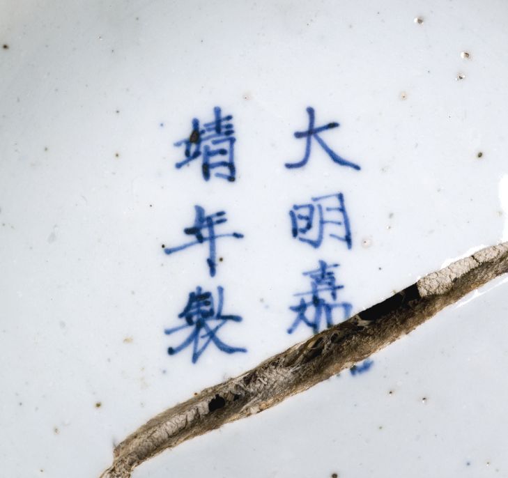 onder op de bodem in kobaltblauw: vertikaal zesmerk Jiajing (Nederlands)