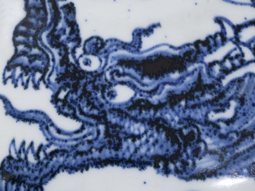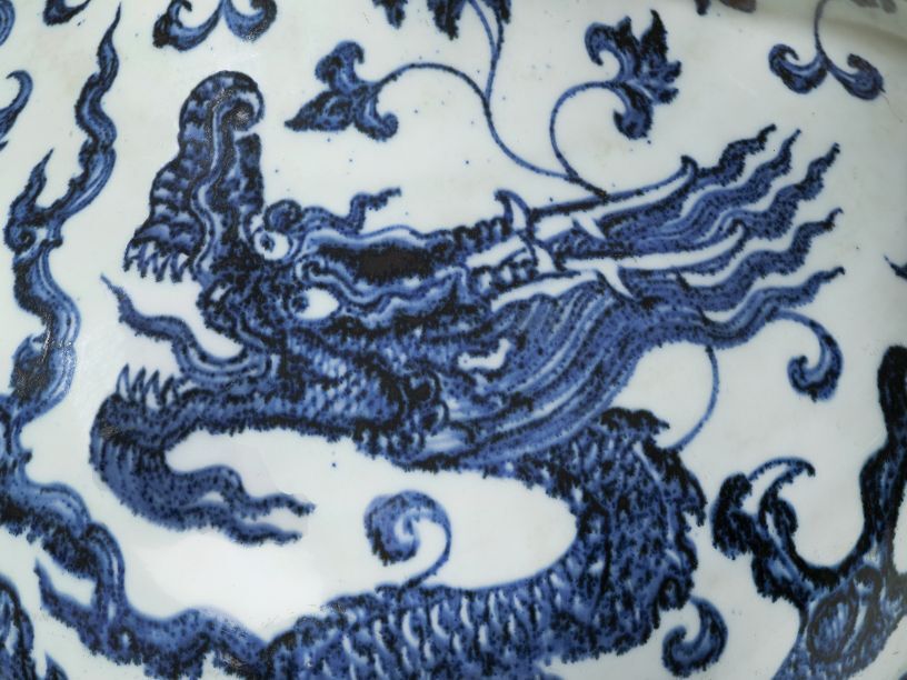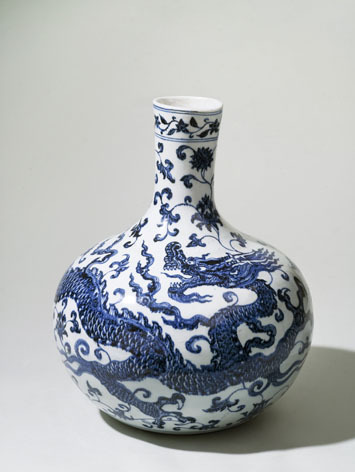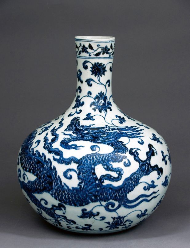 Ietswat onregelmatige bolvormige vaas. Deze vorm staat in het Chinees bekend als tianqu ping en is kenmerkend voor de regeringsperioden van de keizers Yongle en Xuande. De indrukwekkende vaas is beschilderd in een helder, donker kobaltblauw met een levendige en krachtige drietenige draak op jacht naar een parel en omringd door lotusranken. De vaas is een schitterend voorbeeld van de stijl die heerste tijdens de regeringsperiode van de keizer Yongle in de Ming dynastie. Dit is één van de bloeiperiodes van het klassieke blauwwit porselein . Het witte en glanzende oppervlak, de diepe kleur van het kobalt, en het opgehoopte effect van donkere, onregelmatige vlekjes in het blauwe pigment zijn kenmerkend voor dit type object. Het opmerkelijke contrast tussen de donkere vlekken en het rijke, krachtige blauw werd destijds zeer gewaardeerd. Deze vaas is waarschijnlijk geproduceerd in de keizerlijke ovens van Zhushan, vlakbij Jingdezhen. De draak heeft drie tenen en was waarschijnlijk bedoeld als gift voor een buitenlandse heerser. De herkomst van de vaas is de Sangir-eilanden in Indonesië. Mogelijk is de vaas meegenomen op een van de zeetochten van Admiraal Zheng He (1371-1433). als dipl... (Nederlands)