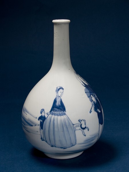 Fles beschilderd in onderglazuur blauw met decoratie van een vrouw met naast haar een kind en hond. Aan haar rechterzijde staan twee mannen waarvan één een parasol/paraplu vasthoudt en de andere een wandelstok. Daar weer links van staan twee mannen met ieder een ingeklapte parasol/paraplu in hun hand. De afgebeeld vrouw is Titia Bergsma. Op 13 februari 1786 wordt zij aan de Nieuwestad 63 te Leeuwarden geboren. Zij is de eerste westerse vrouw die Japan bezoekt. Haar portret staat afgebeeld op talloze Japanse prenten en voorwerpen. Zo ook op deze vaas die Nanne Ottema in 1933 koopt bij de Oost-Aziatische Handelsmaatschappij. Titia is gekleed in een wijde, lange rok en een getailleerde jas met lange mouwen; op haar hoofd heeft zij een bonnet. In 1815 trouwt Titia met Jan Cock Blomhoff. Blomhoff was kort daarvoor in Nederland teruggekomen uit Japan, waar hij magazijnmeester was in Deshima. Dit is een kunstmatig aangelegd eilandje in de Baai van Nagasaki waar Nederland als enige Westerse land handel drijft met Japan. Op 6 maart 1816 krijgen Titia en Jan een zoon, Johannes, en kort daarna vertrekken ze naar Batavia. Al snel na hun aankomst wordt Blomhoff aangesteld hij Opperhoofd... (Nederlands)