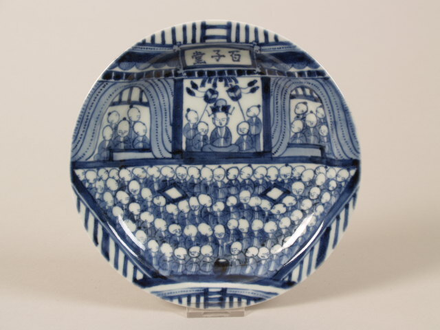 Bord beschilderd in onderglazuur blauw. Over het gehele oppervlak een decor van een tempel met een grote menigte. Op de achtergrond een podium met drie openingen. In elk van de openingen zit een door vier dienaren omringde figuur. Boven het midden van het podium staan drie karakters 百子堂 die vertalen naar ‘’honderd zonen hal’’. Waarschijnlijk gaat het om een boeddhistische scène. Op de bodem drie proenafdrukken. (Nederlands)