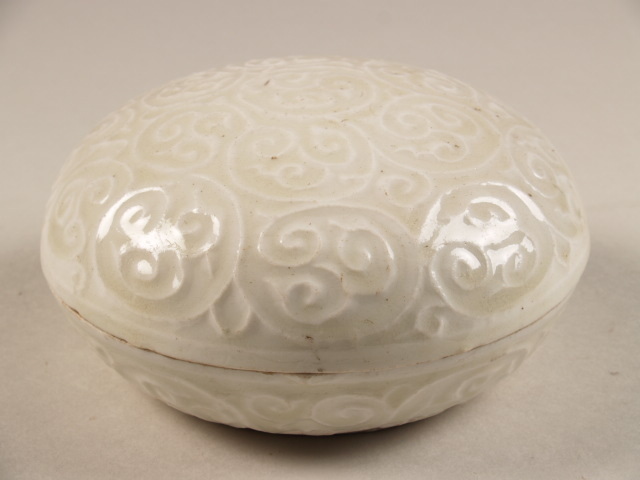 Doos uit twee delen met een decoratie die is onstaan door in de mal ingegrifte lineaire ranken. Deze zijn aangebracht op de buitenzijde van het onderste en bovenste deel. De doos is bedekt met een dikke witachtige glazuur. Dit type decoratie is mogelijk geïnspireerd op lakwerk dat bekend staat als guri of tixi en dat vanaf de Tang dynastie werd vervaardigd. (Nederlands)