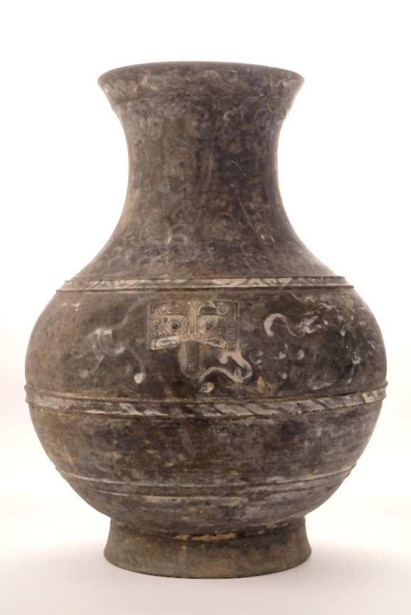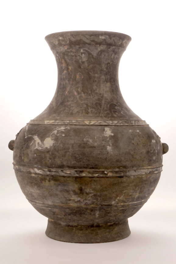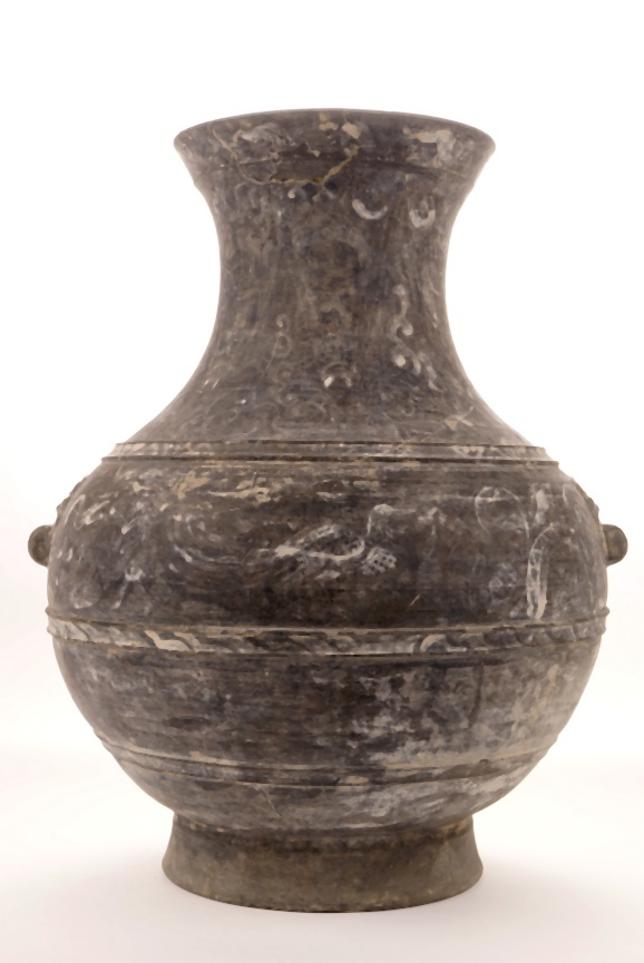 Vaas zonder deksel voor het houden van wijn, koud beschilderd. Imiteert een hu-vorm bronzen of lakwerken vaas met vergelijkbare decoratie. Oude beschrijving: Rechte bodem, licht hol spreidende hoge voetring, breed eivormige wand, hol verjongende hals, hol spreidende liprand, horizontaal afgesneden lip. Op de buik drie horizontale banden met concaaf oppervlak. Tussen de bovenste twee zijn geappliqueerd twee monsterkop-achtige ornamenten met van onderen een staande halveschijf-vormige uitkropping. Grijs aardewerk, ongeglazuurd. Versiering: op de buitenwand geschilderd met koud opgebracht pigment, waarvan vuilwit en enige sporen van roze te onderscheiden zijn. Op de onderste band en de zones daaronder en -boven: onleesbaar. Op de tweede band liggende s-vormige motieven, misschien bedoeld als een cursieve meander. Tussen de tweede en de derde band: de monsterkop-reliëfs gekleurd; ertussen: a) een draak en een man; een fêng-huang, een in slangen uitlopende poort waarop een vogel zit; b) een man tussen twee ch'ih-lin. Op de bovenste band driehoeken met onderbroken basis, om en om staand en hangend. Op de hals: zes staande punten met krulornament, in de hangende punten ertussen enig ... (Nederlands)