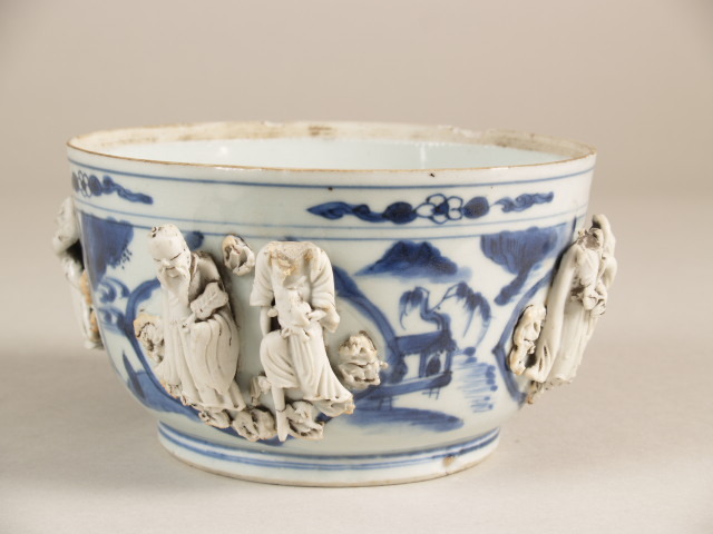 Kom met decoratie in onderglazuur blauw en biscuit figuren in reliëf. Oorspronkelijk zal er nog een deksel bij gehoord hebben. Op de buitenkant van de kom bevindt zich een landschap en vier medallions gevuld met biscuit figuren in reliëf. Deze figuren stellen de Taoïstische Acht Ontsterfelijken voor. Ze zijn waarschijnlijk deels met een mal vervaardigd en deels met de hand bewerkt. Naast dit soort kommen zijn er ook wierookbranders, een vaasje en kommen met een deels opengewerkte rand bekend met figuren in reliëf, meestal de Onsterfelijken. Deze decoratie werd in plaats van met blauwwit beschildering ook wel gecombineerd met emails in bruin, geel en groen op het ongeglazuurde porselein. Uit de inventaris van Almarlia van Solms opgemaakt tussen 1654-1668 is op te maken dat zij waarschijnlijk twee van dit soort kommen bezat: 'twee ronde potkens met deksels ende poppen daaraan'. Ook in de inventaris uit 1683 van Madeleine Fabry Séguier wordt een dekselkom met figuren in reliëf vermeld. Deze kommen zullen waarschijnlijk niet specifiek voor de export markt gemaakt zijn, maar toch kwamen dit soort stukken in Europa terecht. Op verschillende stillevens van Willem Kalf (o.a. Still-L... (Nederlands)