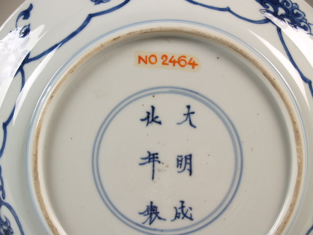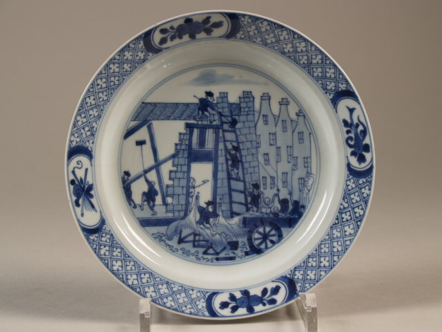 Bord op voetring met spreidende wand en platte spreidende rand, versierd in onderglazuur blauw. Op het plat een afbeeldi...jd stadsbaljuw in Rotterdam. Onderbedreiging bekende Costerman aan Van Zuyl...||China||Keramiekmuseum Princessehof NO 02464