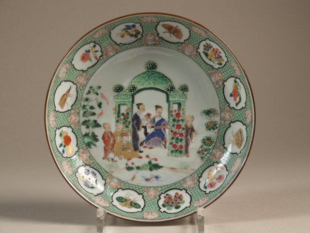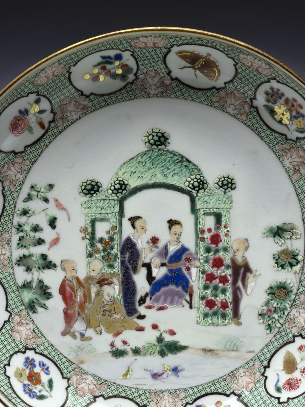 Schaal op voetring met spreidende wand en rand, versierd in diverse emailkleuren en gehoogd in goud. Op het plat een voorstelling met een Europees prieel met een dame. Een andere dame biedt haar een bloem aan. Buiten het prieel vier jongetjes en twee bloeiende planten. Op de voorgrond een water met zwemmende eenden. Op de wand een ruitpatroon in groen met uitgespaard twaalf liggende ovale medaillons. In de medaillons afwisselend bloeiende takken en insecten. Tussen de medaillons telkens een schelp en een palmet in de stijl van Daniel Marot. Onder de rand aan de achterkant in ijzerrood en paars een rand met lambrequins en culots. Deze voorstelling wordt ook wel 'Het Prieel' genoemd en is ontworpen door Cornelis Pronk. Pronk porselein (1691-1759) Cornelis pronk begon zijn carrière als schilder en maakte daarnaast ontwerpen voor Chinees porselein. In augustus 1734 gaven de Heeren XVII hun goedkeuring aan hun Delftse afgevaardigden om Cornelis Pronk een contract van drie jaar aan te bieden. Hij werd hierin verplicht om ieder jaar een ontwerp af te leveren dat geschikt was om over te nemen op Chinees porselein. Niet alleen van de versiering, maar ook van de vorm van elk verschille... (Nederlands)