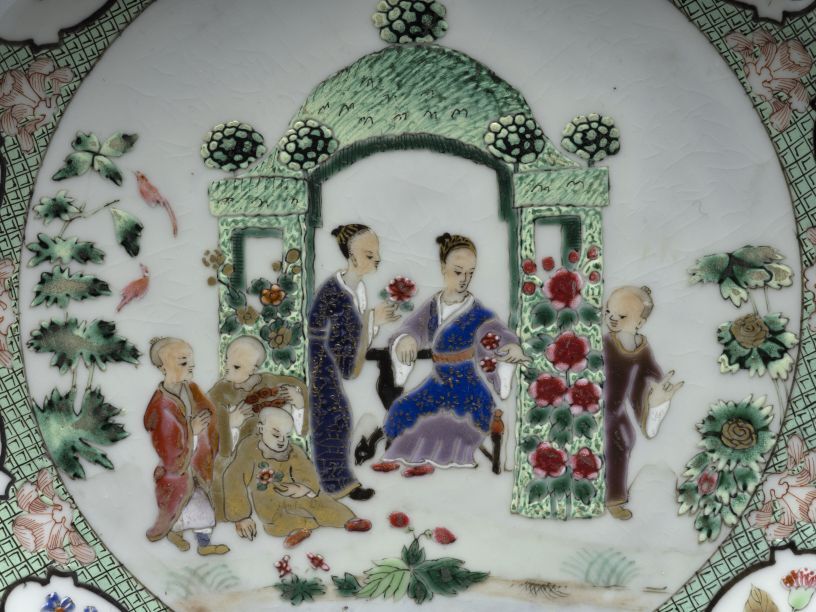 Schaal met decor Het Prieel, voorstellende dames in een tuin, chine de commande, famille rose (Q29544)
