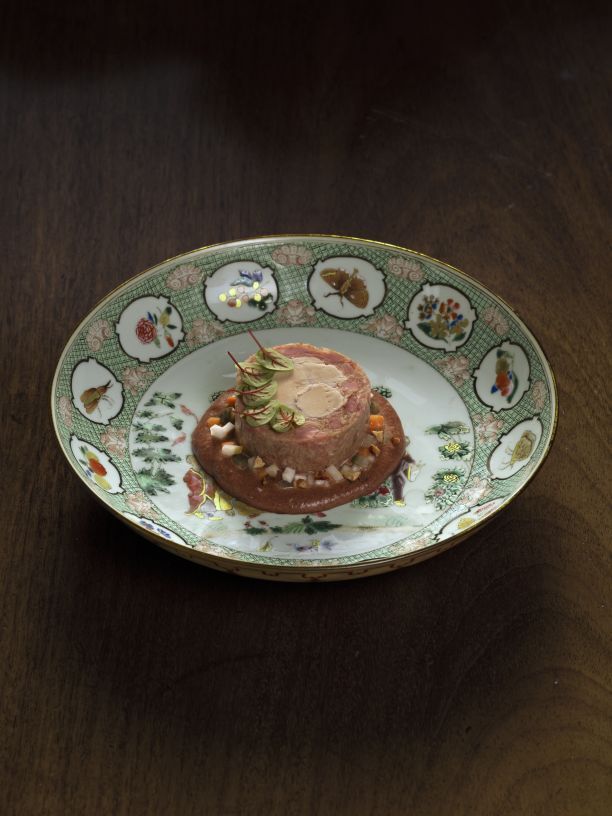 Schaal op voetring met spreidende wand en rand, versierd in diverse emailkleuren en gehoogd in goud. Op het plat een voo...van de versiering, maar ook van de vorm van elk verschille...||China||Pronk, Cornelis||Keramiekmuseum Princessehof NO 02484