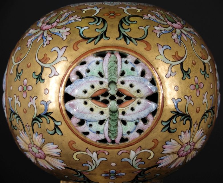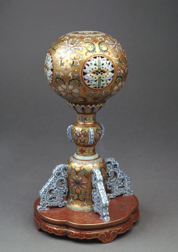 Hoedenstandaard met kleine deksel. De standaard heeft een standplaat met een verticaal hangende rand waarin vier Ruyi vormige pootjes zijn uitgesneden. De stam van de standaard loopt uit in een open bloemkelk, waarop het kogelvormige vat rust. Dit vat heeft vier ajour gesneden medaillons met telkens twee vlinders. Bovenin het ronde vat een ronde opening met een liggende sluitring. De deksel heeft een opengewerkt bovenvlak. Het hele glazuuroppervlak is bedekt met gekleurde emails. De binnenzijde van het vat en de deksel zijn lichtgroen. Dit object diende om een hoed op te plaatsen. In de bolvormige bovenkant van de parfumeerstandaard stopte men geurstroffen. Deze geur ontsnapte via de openingen in de boven- en zijkant en hield zo de hoed fris. De openingen hebben de vorm van twee vlinders die elkaar aankijken. Vlinders worden in China geassocieerd met geur. Op het vlak rondom de ‘vlinderopeningen’ zijn gestileerde lotusbloemen en krullen aangebracht. Het merk onderop, met de zes karakters van keizer Qianlong, is elegant uitgevoerd in goud. De decoratie van de standaard is tot in de kleinste details uitgewerkt. Het laat interessante combinaties zien: zo is het centrale deel vergu... (Nederlands)