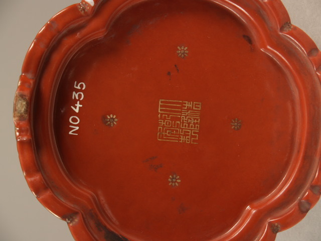 Hoedenstandaard met kleine deksel. De standaard heeft een standplaat met een verticaal hangende rand waarin vier Ruyi vo...erkt. Het laat interessante combinaties zien: zo is het centrale deel vergu...||China||Keramiekmuseum Princessehof NO 00435