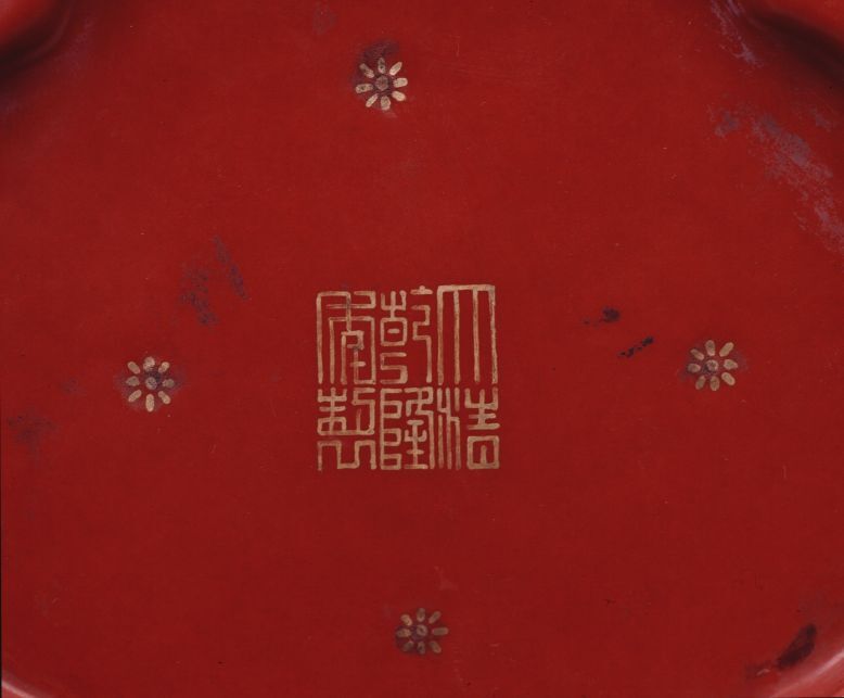 Op de bodem in goud een Qianlong zeskarakter merk. (Nederlands)