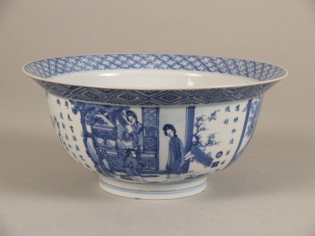 Versiering in kobaltblauw. Plat: een landschap met op de achtergrond een terras (?); 5 spelende jongetjes met een perziktak en een vogel. Rand intern geruit. Wand extern: 4 scènes, waarin respectievelijk de voorstelling van een heer met zijn knechtje intern; het knachtje dat een brief heeft gebracht aan een meisje; het meisje dat met een oude heer praat; 2 oudere heren, vergezeld elk door een dienaar, bijeen. Links van de voorstelllingen telkens een bijschrift. Rand extern geruit. Chinese tekst: Da ping shi zhang junzi ben Ni yi fuxiong zhang shi qi ren Yi lai shu lei hen zi you wo jiang zi xin hen ba jui hen shi dou Xie shi he lei xie feng shi he lei feng Ni guo shi da neng ru xiang zu zi neng gou hou fu qi ru shui ru yu Vert. Zij moet zich verlaten op haar leermeester en op haar vader en broers die haar onderdrukken (tijdens de afwezigheid van haar echtgenoot). Na de brief (van mijn echtgenoot) te hebben ontvangen maken tranen zich van mij meester en worden de oude sporen weggewist door nieuwe tranen. Na de brief te hebben geschreven wordt deze met tranen dichtgeplakt. Alleen dankzij uw macht en hulp is het mogelijk dat wij, man en vrouw, weer bij elkaar kunnen zijn zoals w... (Nederlands)
