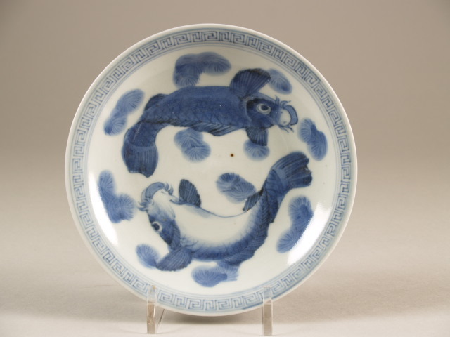Bord beschilderd in onderglazuur blauw. Op het plat een decor van twee zwemmende vissen (karpers) en wieren. De wand is gedecoreerd met meanderende rand. Bord onderdeel van een set van twee borden. (Nederlands)