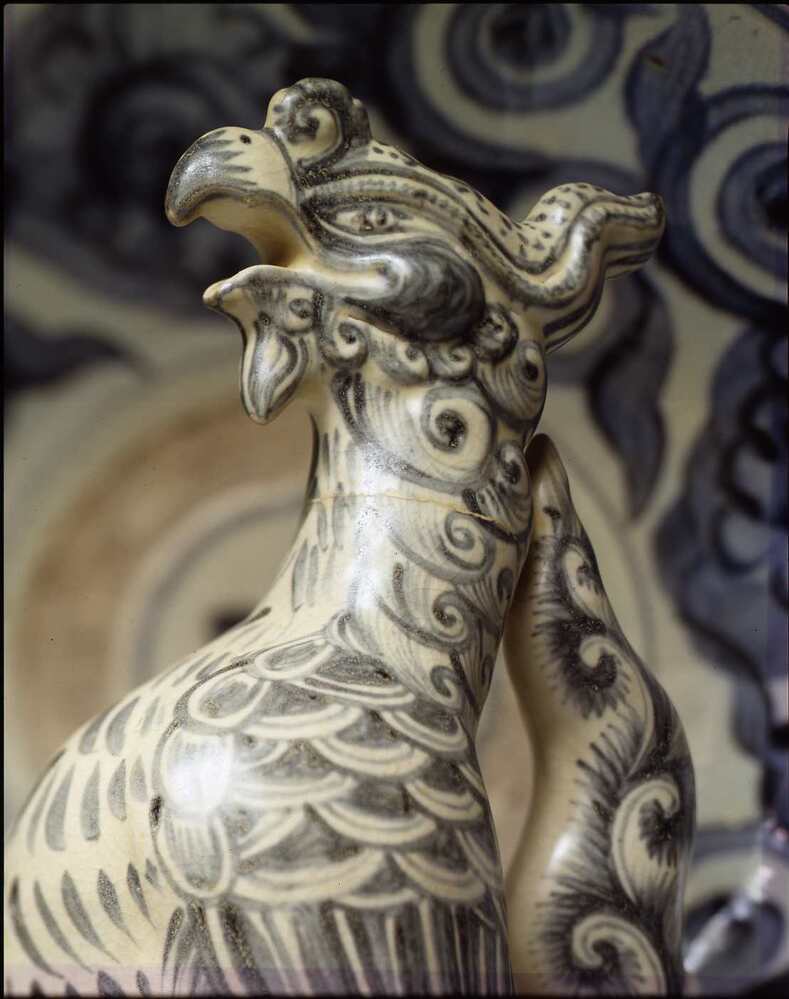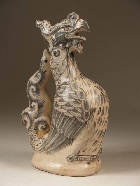 Kan in de vorm van een feniks gedecoreerd in onderglazuurblauw. De keramiekindustrie in Vietnam beleefde rond 1500 een een bloeiperiode, omdat de Chinese regering de export van Chinees keramiek tijdelijk verbood. Veel Chinese pottenbakkers emigreerden naar Vietnam, op zoek naar werk. De Vietnamese keramiek werd vervolgens geëxporteerd naar buurlanden Thailand en Birma maar ook verder weg, naar de Filippijnen en Indonesië. Daar waren vooral voorwerpen met fantasievormen populair, zoals deze feniksvaas. De feniks is in Azië een belangrijk symbool voor wedergeboorte en het eeuwige leven: de vogel zou uit zijn eigen as herrijzen. (Nederlands)
