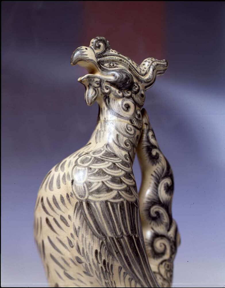 Kan in de vorm van een feniks gedecoreerd in onderglazuurblauw. De keramiekindustrie in Vietnam beleefde rond 1500 een... het eeuwige leven: de vogel zou uit zijn eigen as herrijzen.||Vietnam||Bat Trang||Keramiekmuseum Princessehof GMP 1973-002