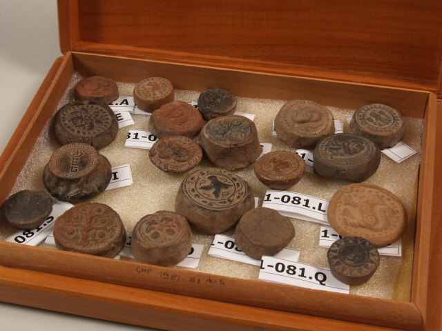 A series of nineteen stamped disk, each one different, in a wooden box. A. discription of backgronund and illustrations of some of the disks is contained in H.R.A. Muller 1978: Javanes Terracottas , secdtion VI Änalogie between Northern Chines and Majapahit Terracottas"at pp. 48-52. Individual disks marked A to S aAre briefly described overleaf: A:-D.. 2,3 cm, with an elephant, cf.pl.92 p.49 in Muller; B:-D. 2,2 cm, with a nut-cuuter, cf.pl.92 p.49 in Muller C:-D. 2,4 cm, with a hatted man, cf.pl.92 p.49 in Muller D:-D. 3,2 cm, with chain links, cf.pl.93 p.49 in Muller; E:-D 3,4 cm., with animal and vegetal motifs in pairs, cf.pl.93 p.49 in Muller; F.-D. 2,7 cm with fishes and a hook, cf.pl.94 p.49 in Muller; G.-D. 3,5 cm, wiht a tree, cf.pl94 p.49 in Muller; H.-D. 3,4 cm, with figures cf.pl94 p.49 in Muller; I.-D. 3,7 cm, with old Javanes scripts, cf. pl.95B p50 in Muller; J.-D. 3,0 cm with a ddeity, cf. pl.96 p.50 in Muller; K. -D. 3,7 cm, with a bird., cf. pl.96 p.50 in Muller; L.-D. 2,7 cm, with a horse, cf. pl.96 p.50 in Muller; M.-D. 4,0 cm, with a shiningha, .pl.97 p.51 in Muller; N.-B. 3,4 cm, with a tree in fruit; O.-D. 2,7 cm, with figures (that one is scarred); P.-D.... (Nederlands)