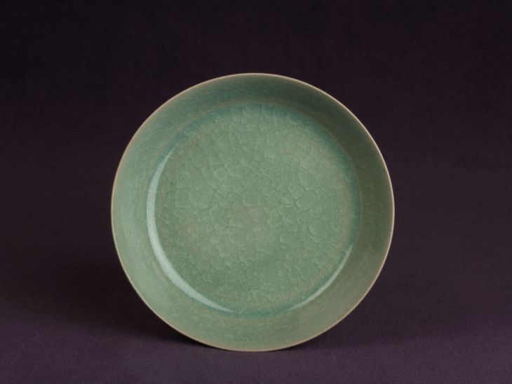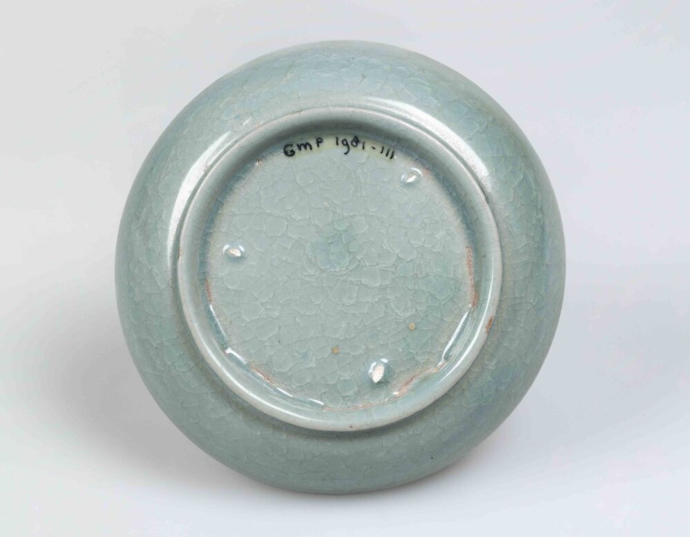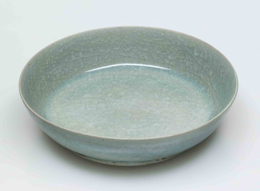 Bakje/schaaltje voor het wassen van penselen bedekt met een groengrijsblauwe gecraqueleerde glazuur. Op de plekken waar ...gewaardeerd. In de achttiende eeuw heeft de keizer Qianlong (1736-1795)...||China||Keramiekmuseum Princessehof GMP 1981-111